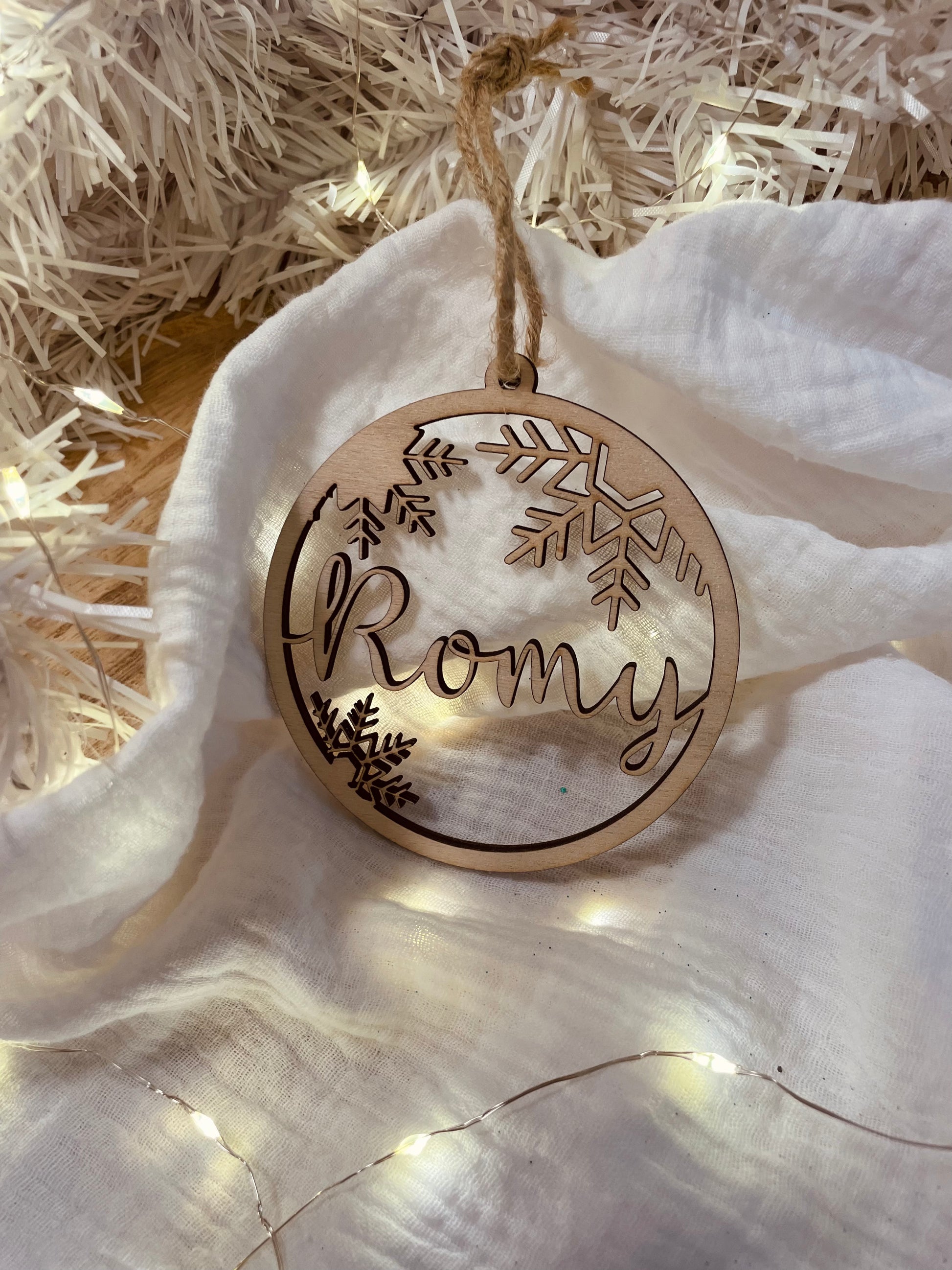 Cette boule de Noël en bois dessiné de plusieurs flocons de neige s'intégrera parfaitement à votre sapin de Noël.