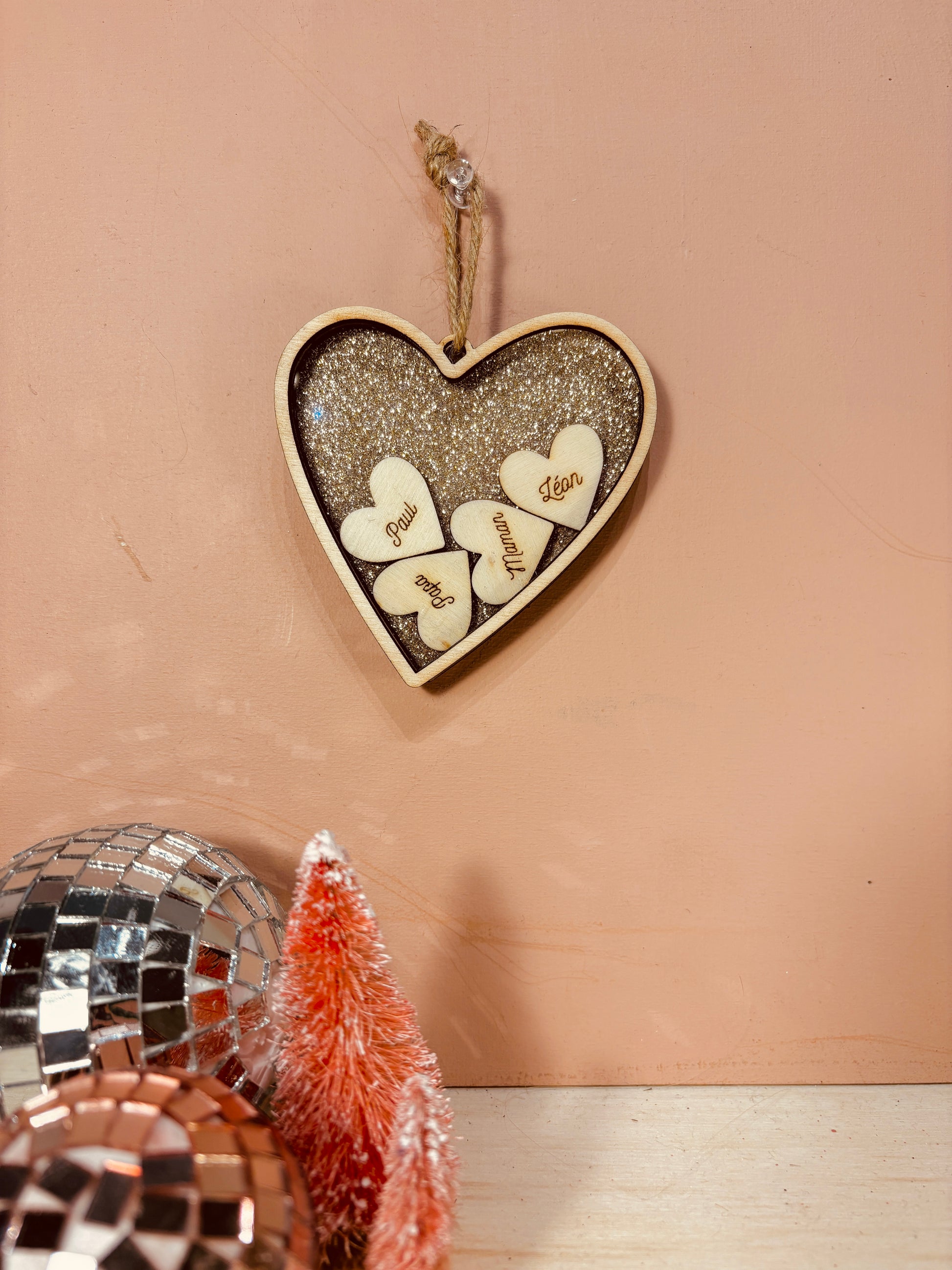 Coup de cœur assuré pour ces deux modèles de boule à suspendre avec un fond à paillettes , le petit plus de celle-ci, vous pourrez y glisser à nouveau un coeur ou un étoile si la famille s'agrandit !Offrez vous ou faîtes vous offrir ce cadeau unique qui viendra embellir votre sapin de Noël.