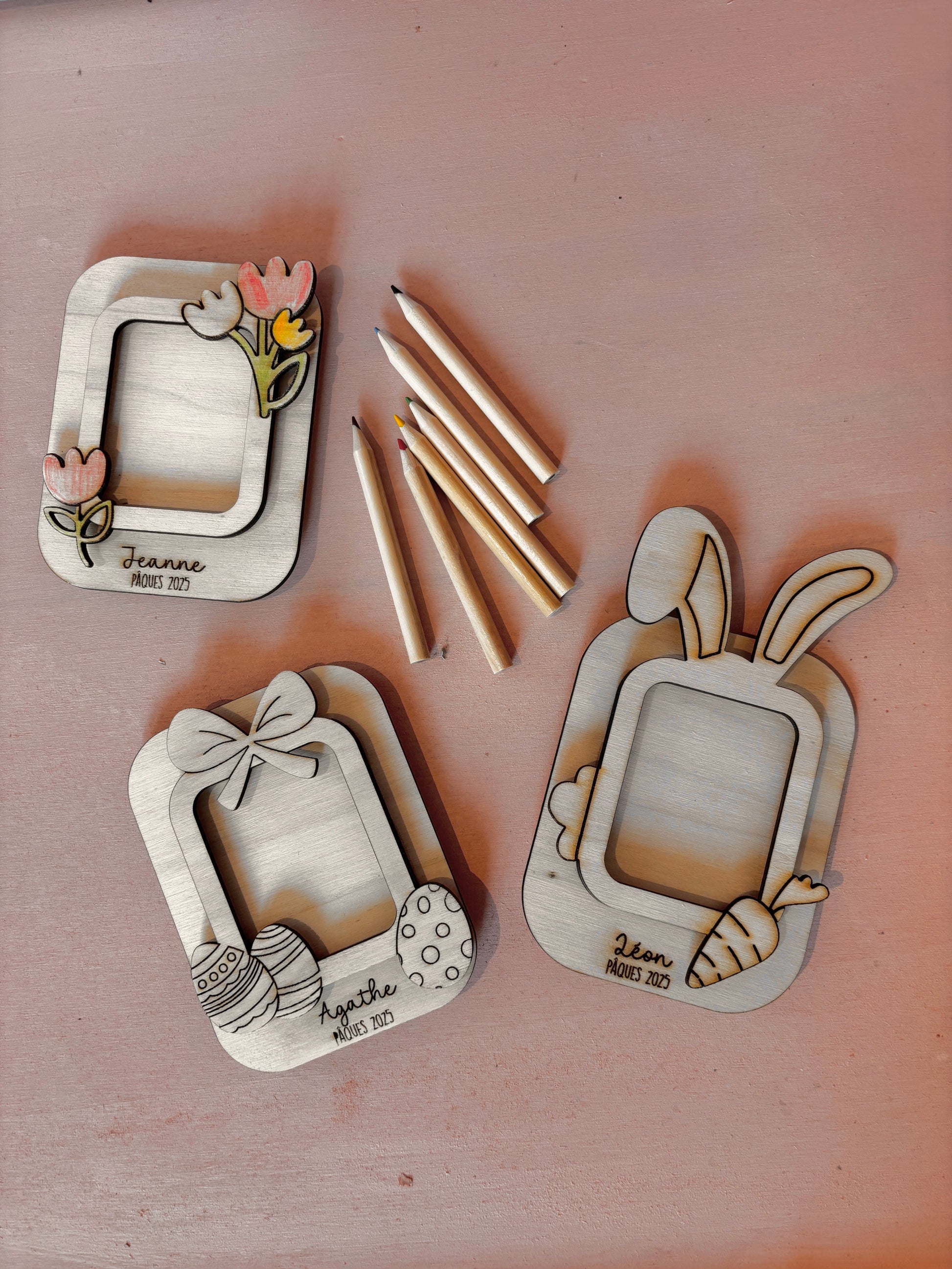 Celle-ci est composée d'une boite en carton, d'un sachet de graines de fleurs ainsi que de sa petite pancarte à planter, un magnet photo à colorier et son lot de crayons de couleurs, un bon à gratter en forme de lapin avec votre message personnalisé, et un sachet de 4 petits sablés.