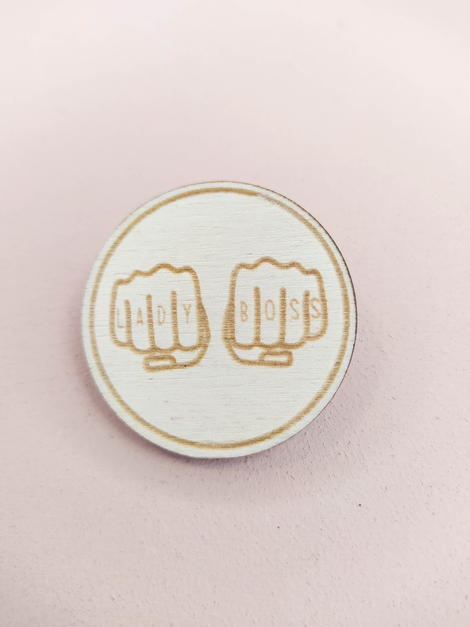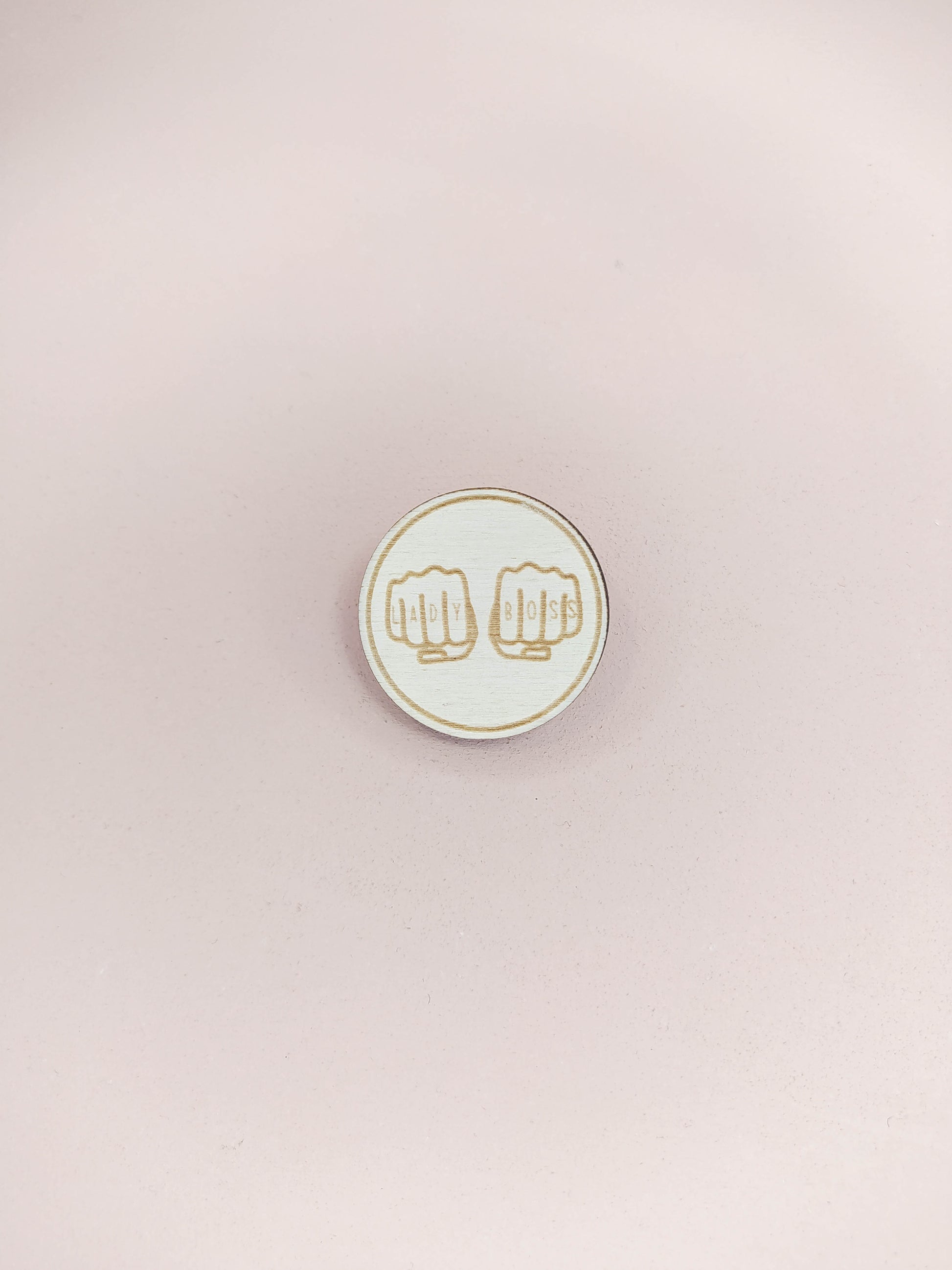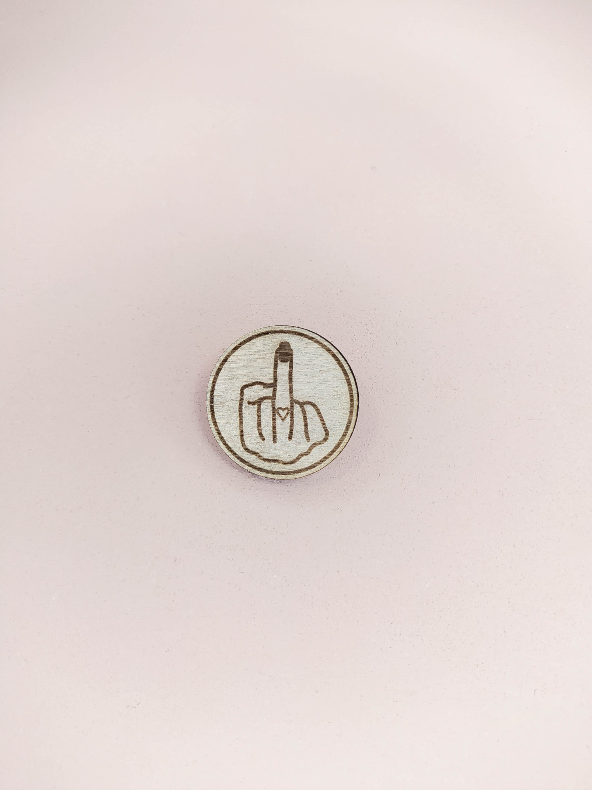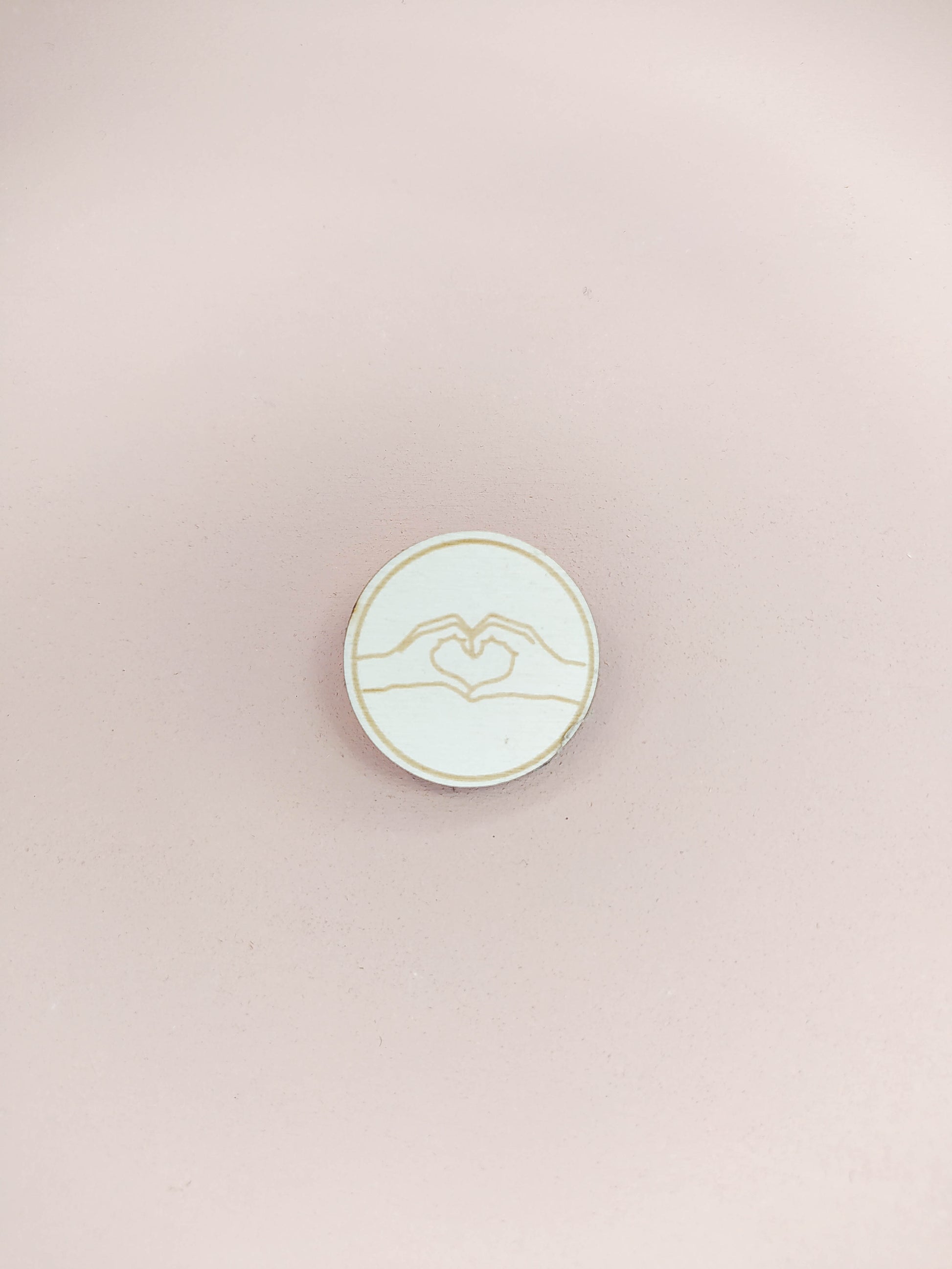 Une jolie broche en bois avec différents dessin de mains gravés.