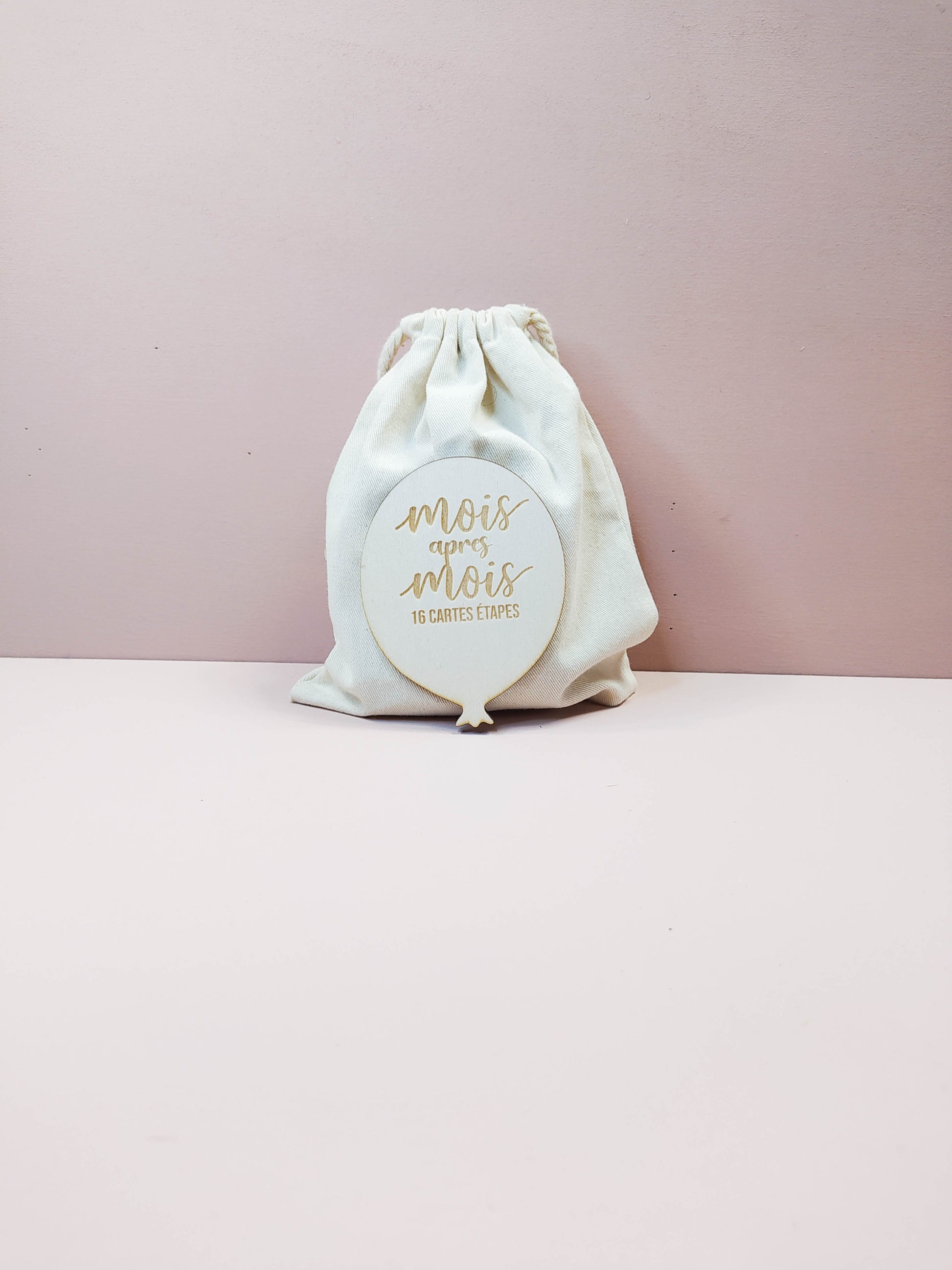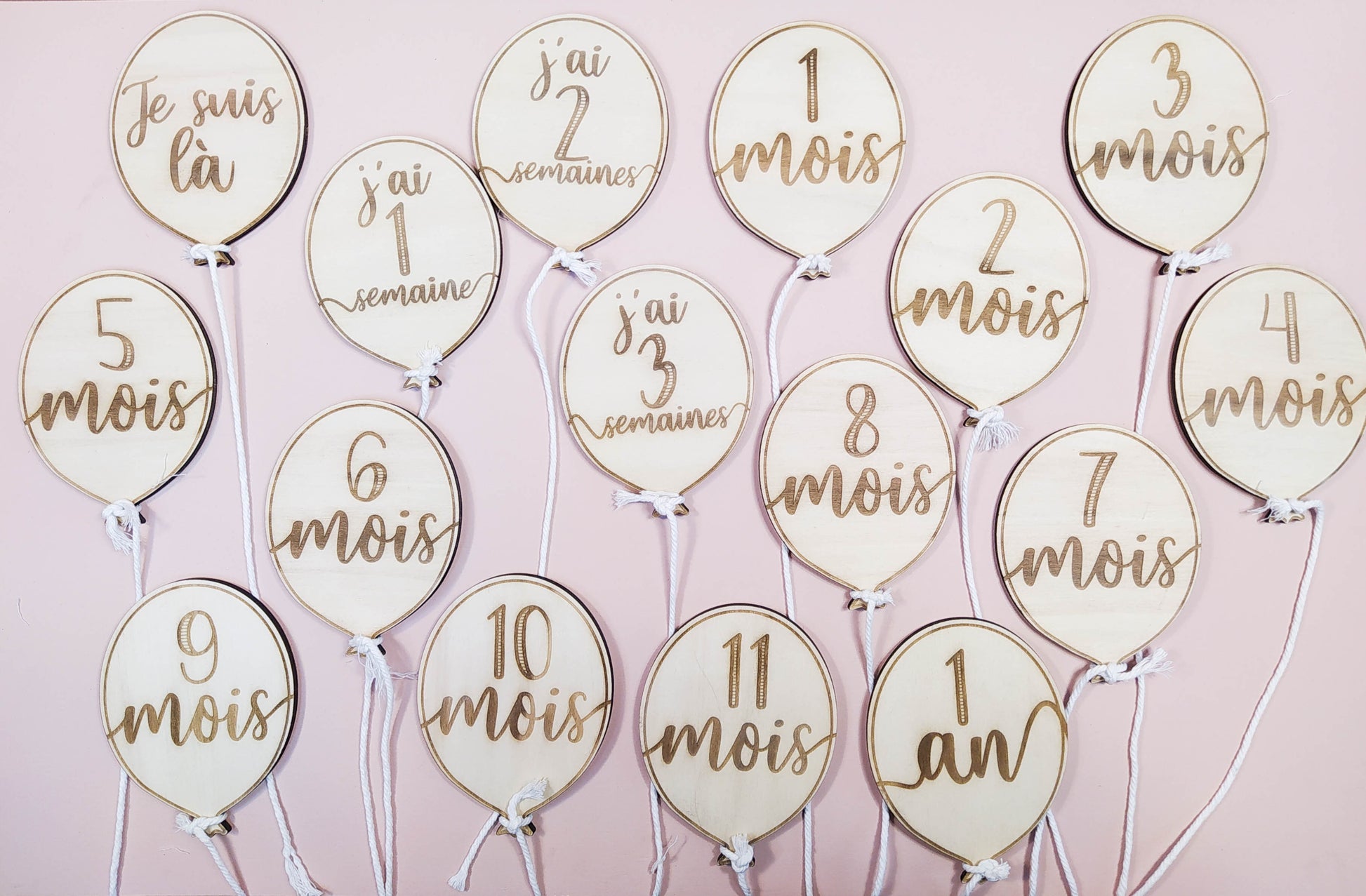 Notre coffret de 16 cartes en bois en forme de ballon gravées vous permettra d’immortaliser chaque semaines et mois en photos la première année de votre bébé.