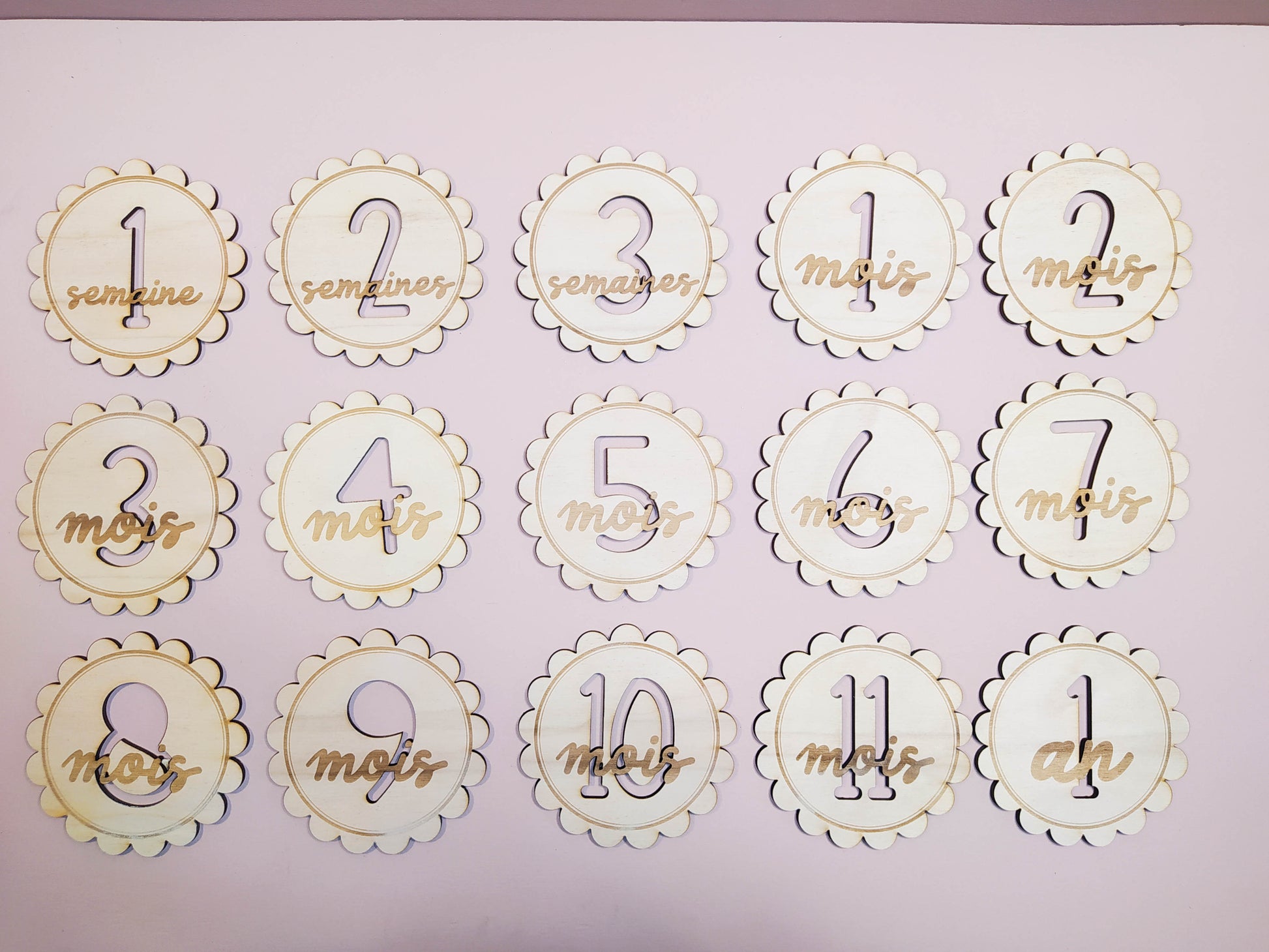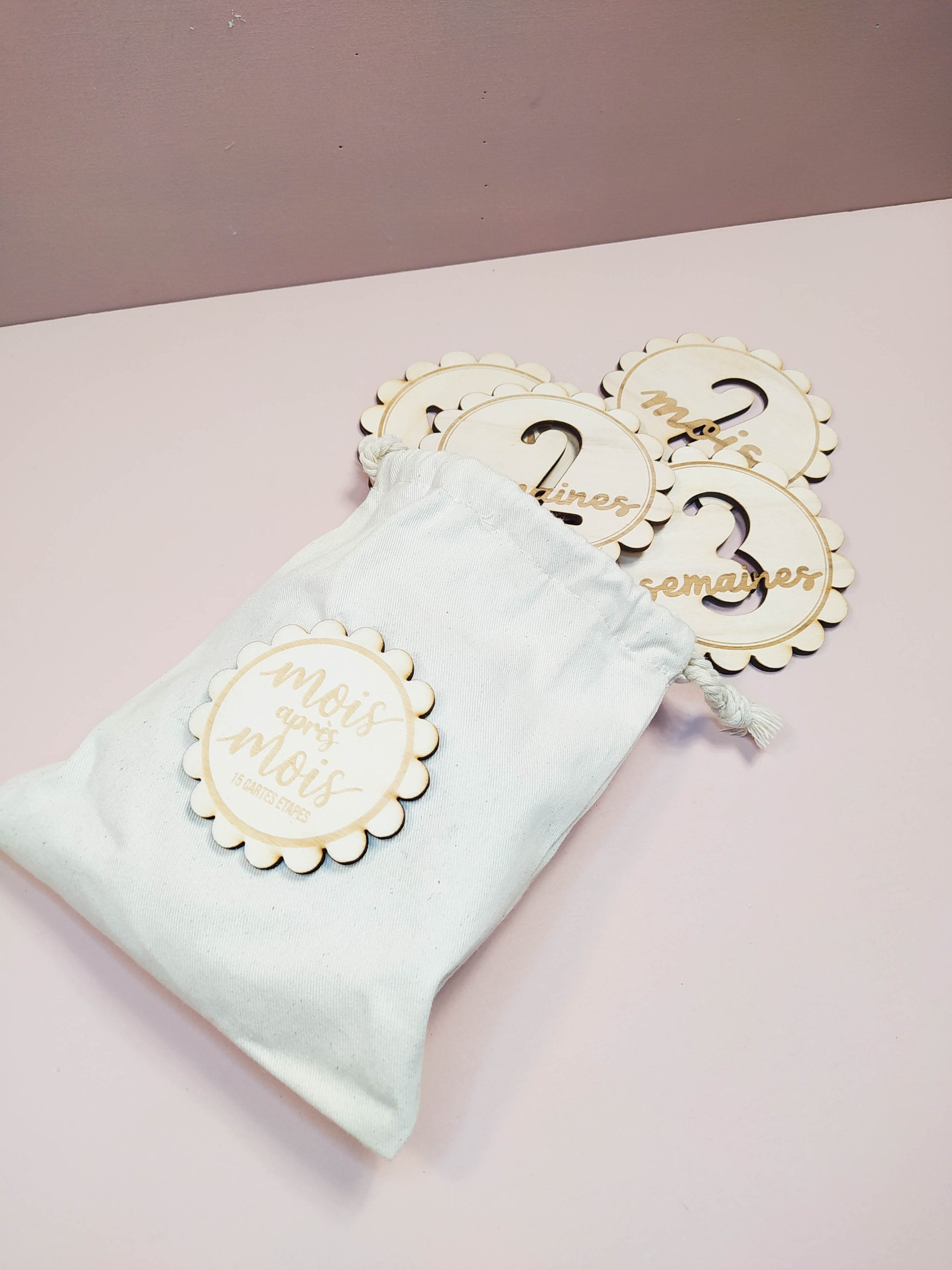 Notre coffret de 15 cartes étapes en bois en forme de fleurs gravées vous permettra d’immortaliser chaque semaines et mois en photos la première année de votre bébé.