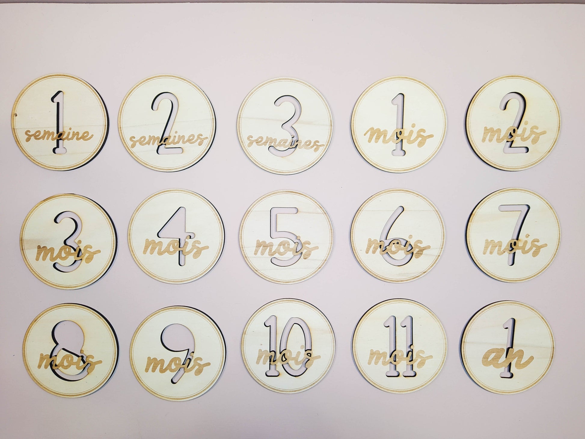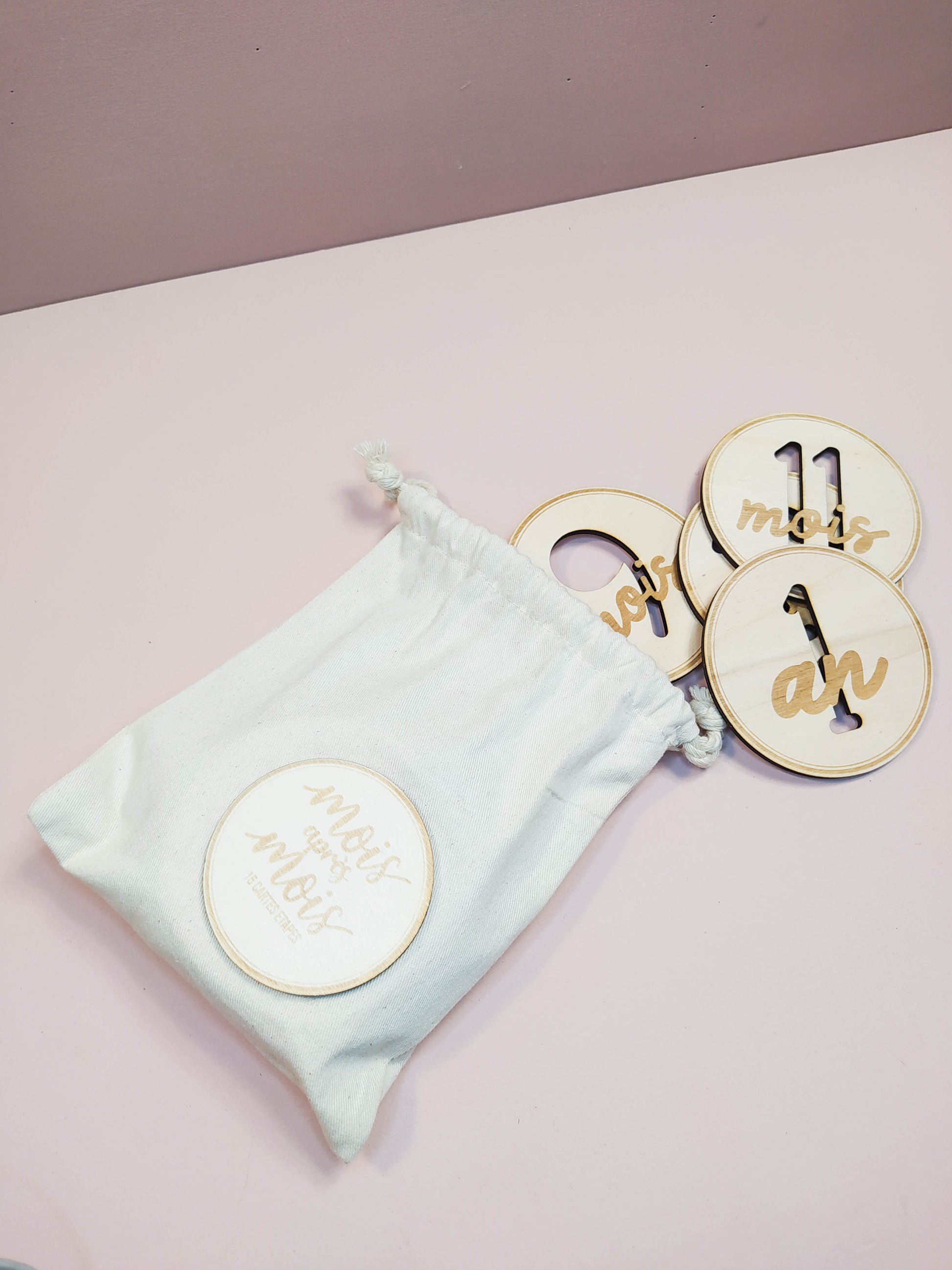 Notre coffret de 15 cartes étapes en bois rondes gravées vous permettra d’immortaliser chaque semaines et mois en photos la première année de votre bébé.