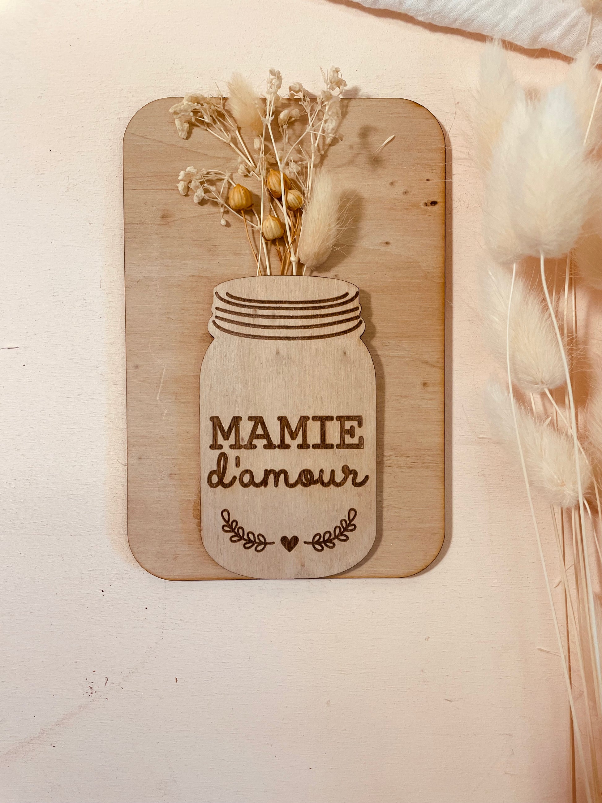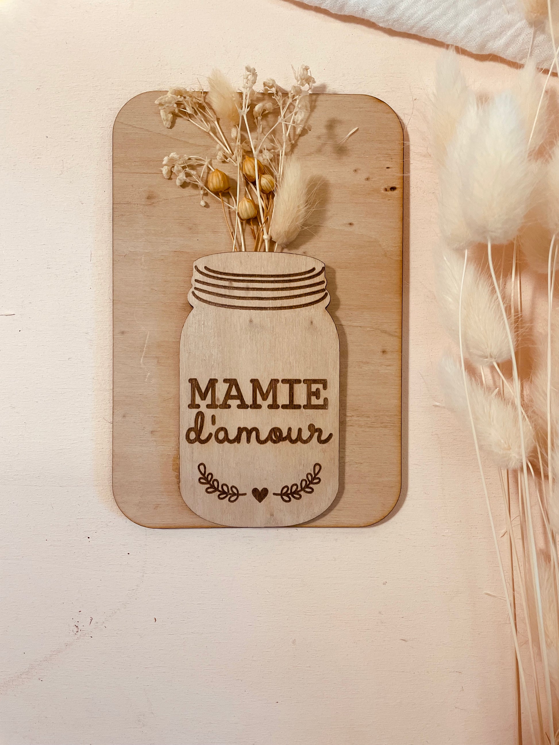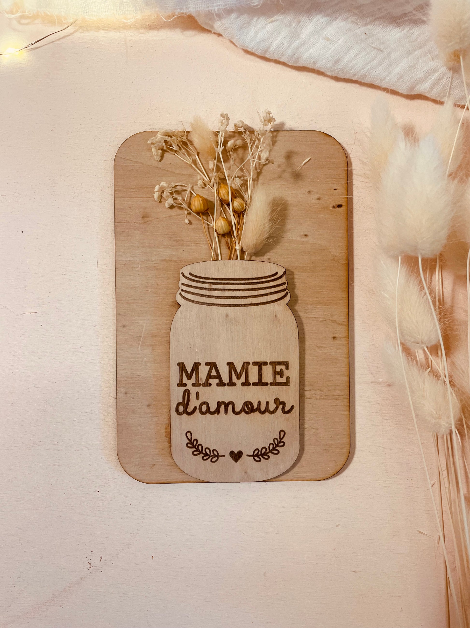 Vous pourrez offrir cette jolie carte en bois composé de fleurs séchées. Coup de cœur assuré pour votre mamie.