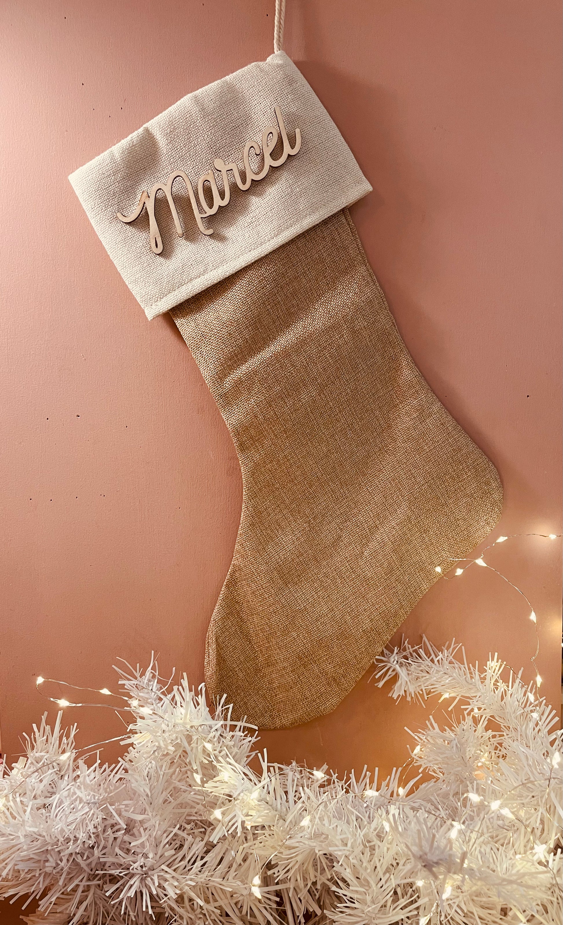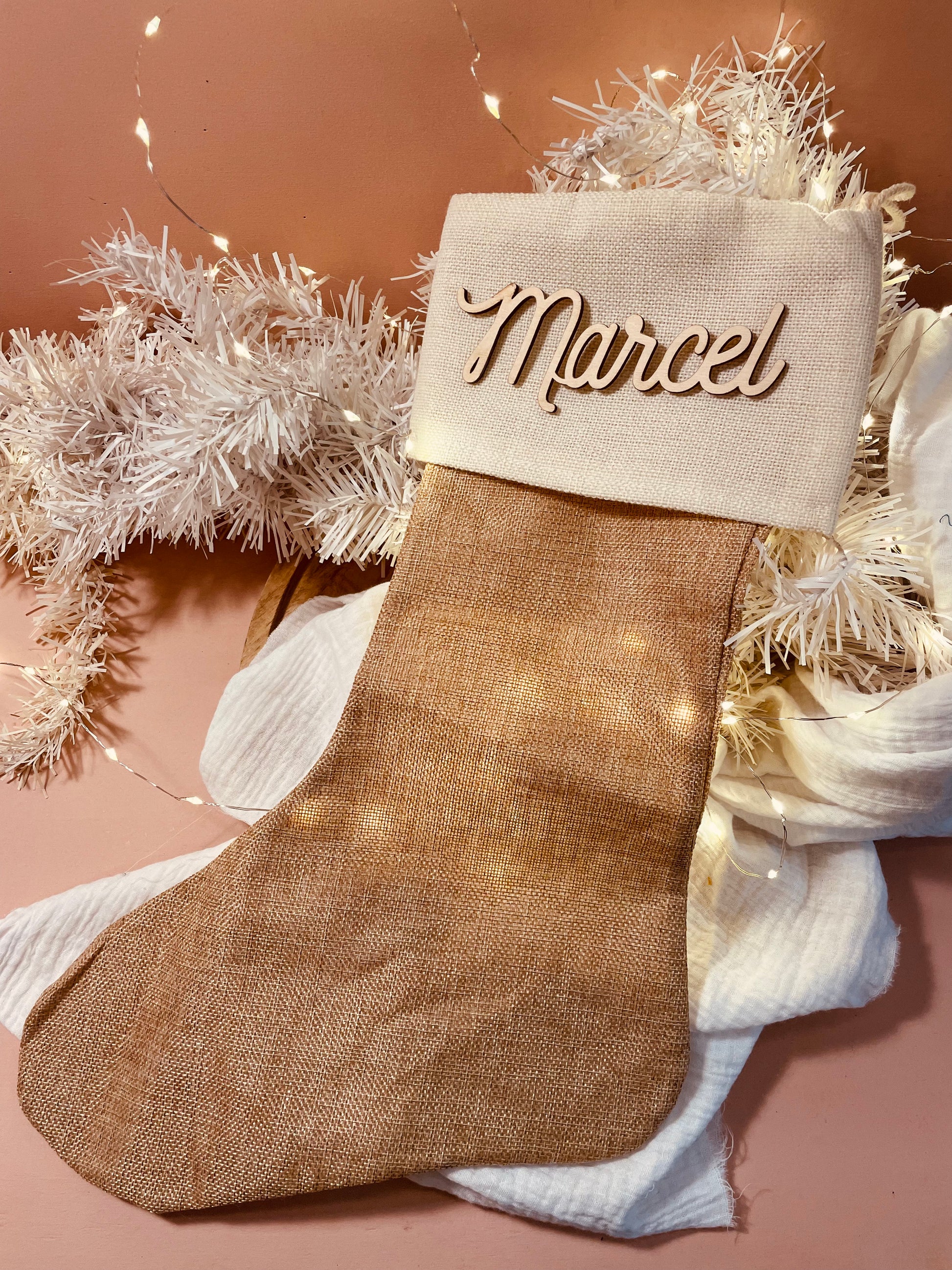 Craquez pour cette jolie chaussette de Noël personnalisée avec son prénom en bois