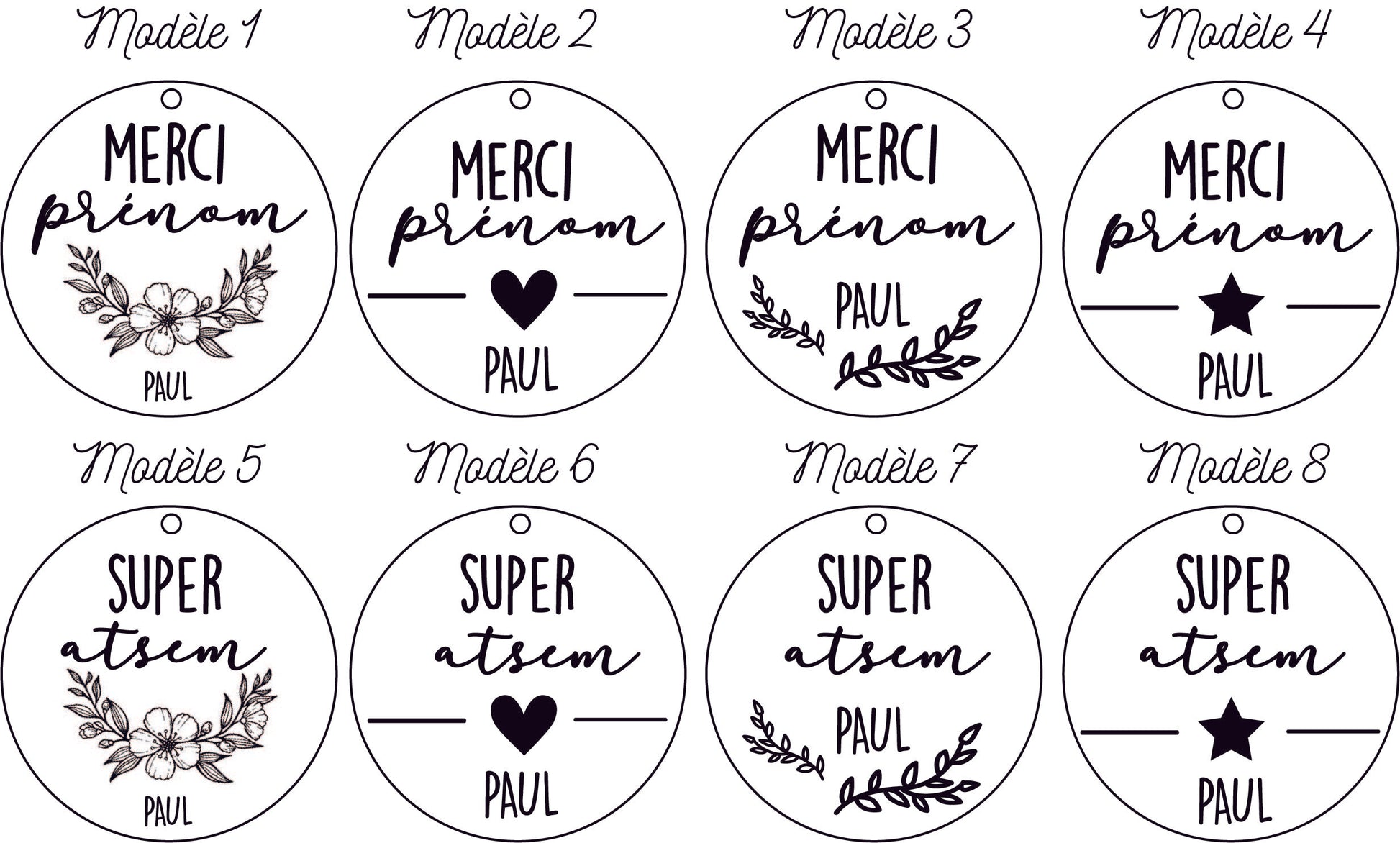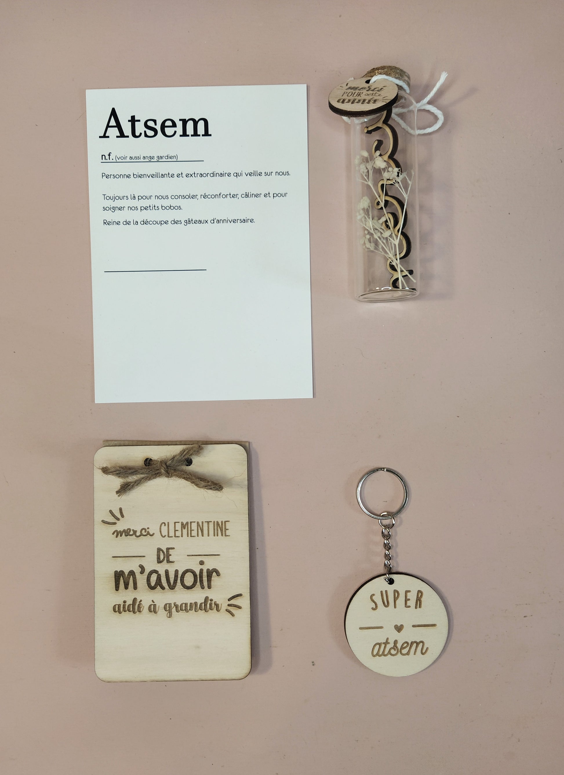Chaque élément en bois sera personnalisé avec le prénom de l'atsem et de votre/vos enfants.