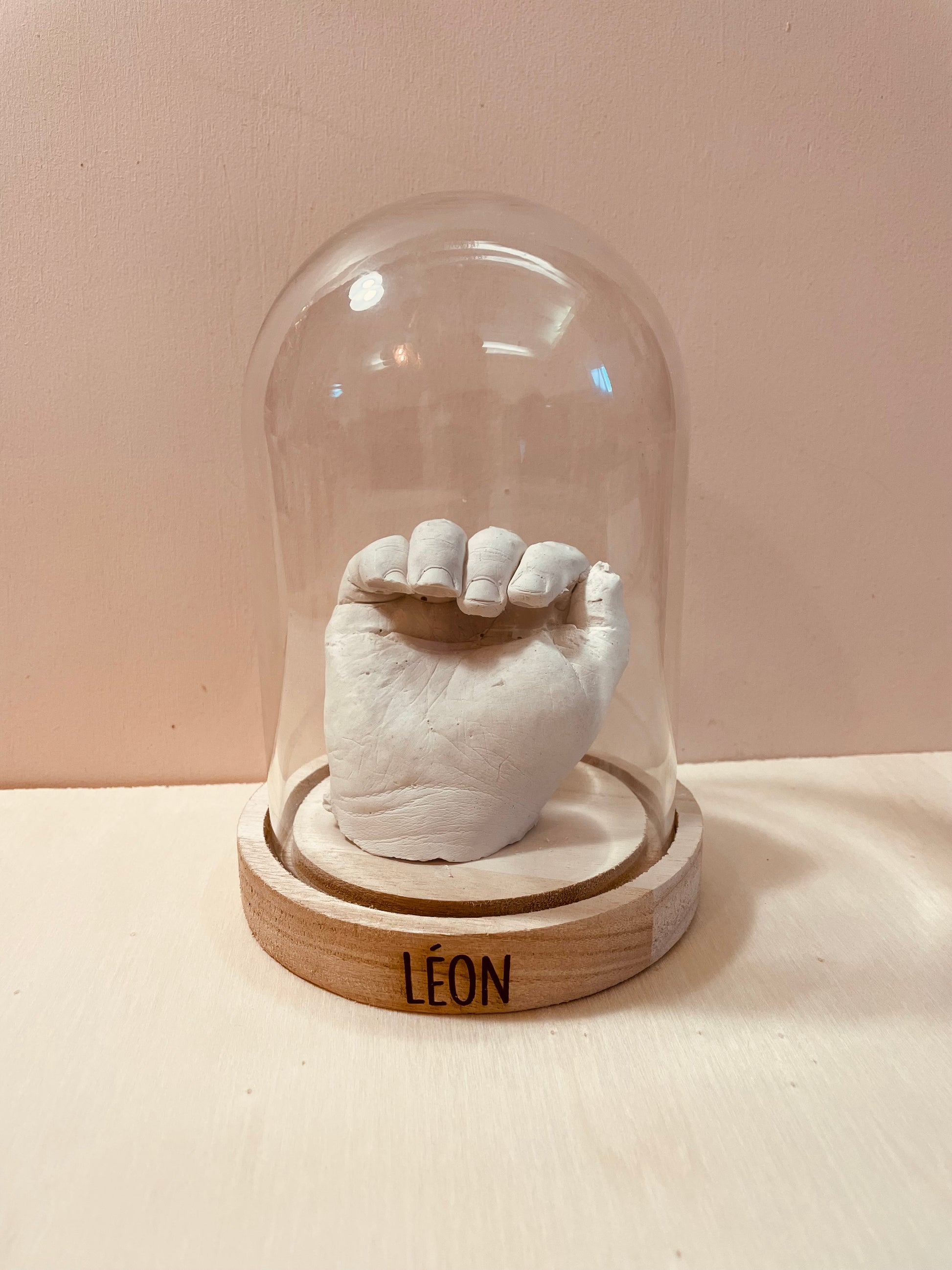 Ce kit vous permettra de mouler vous-même la main de bébé en la transformant en jolie décoration sous une cloche en verre.