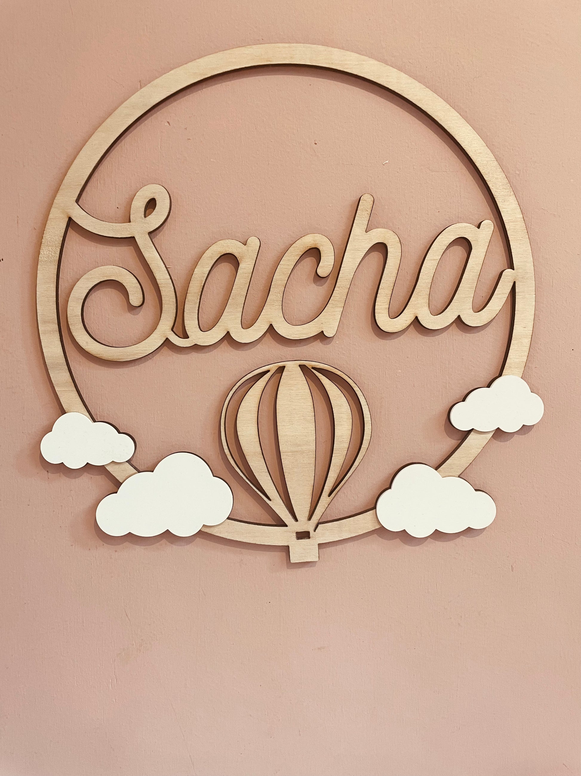 Craquez pour cette jolie couronne sur le thème montgolfière avec le prénom ou le mot de votre choix, qui donnera une touche unique à votre décoration.