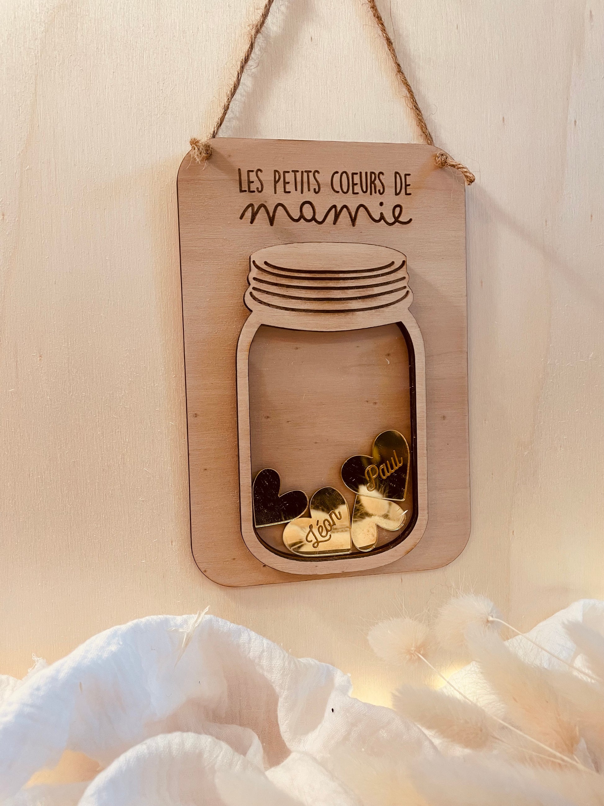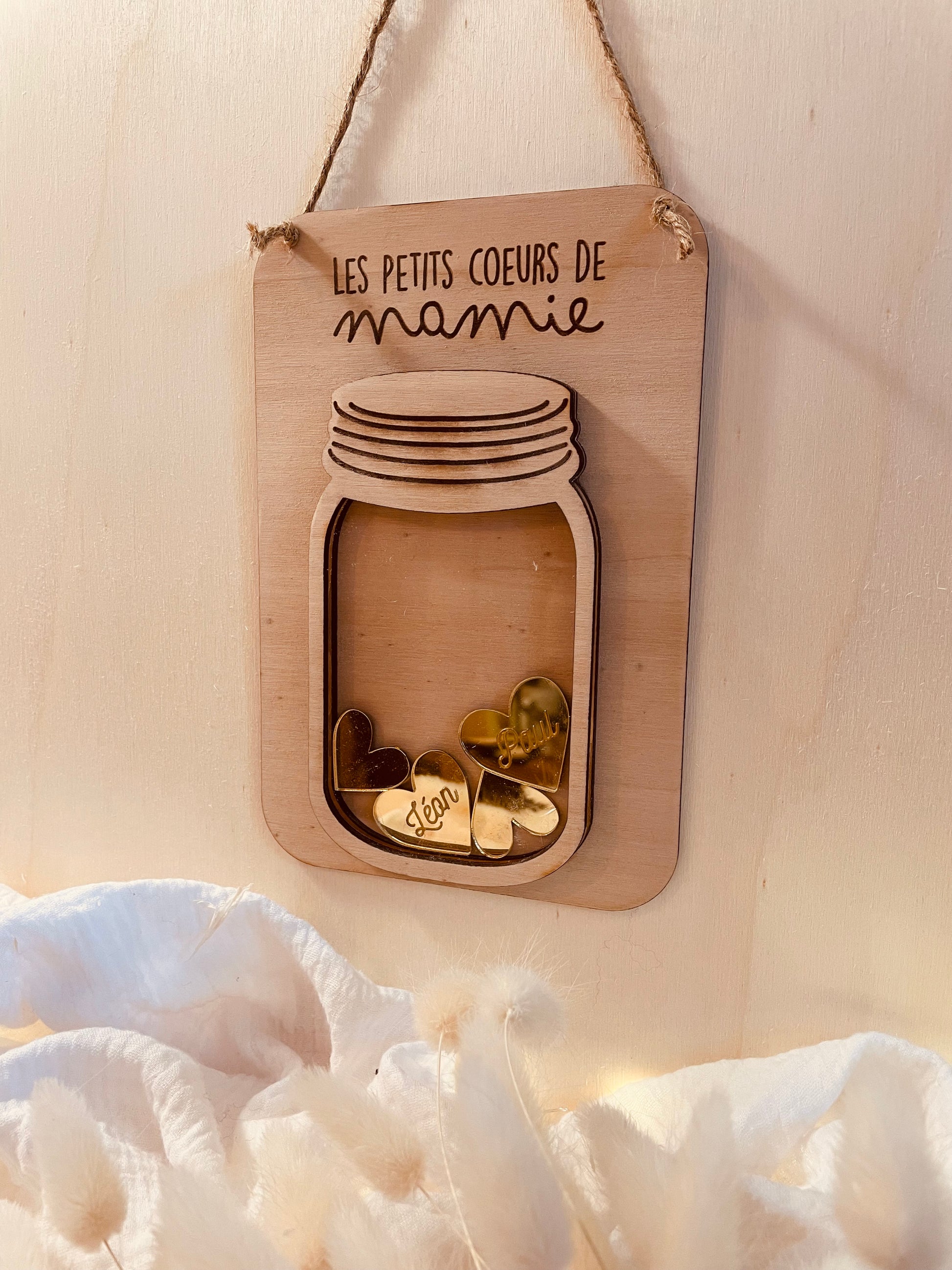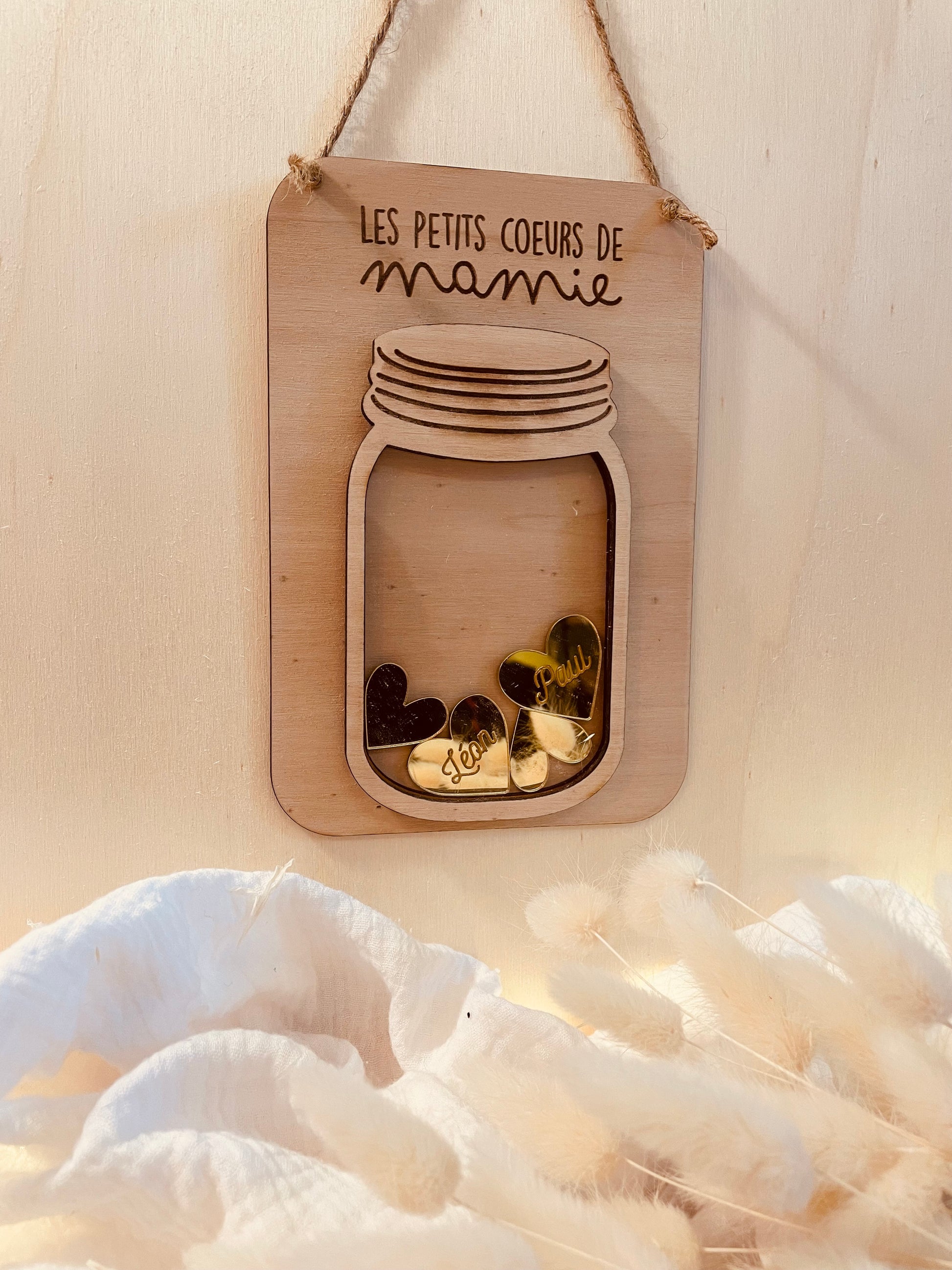 Vous pourrez offrir cette jolie décoration à votre mamie. Nous y glisserons les petits cœurs correspondant aux enfants et/ou petits enfants. Coup de cœur assuré !