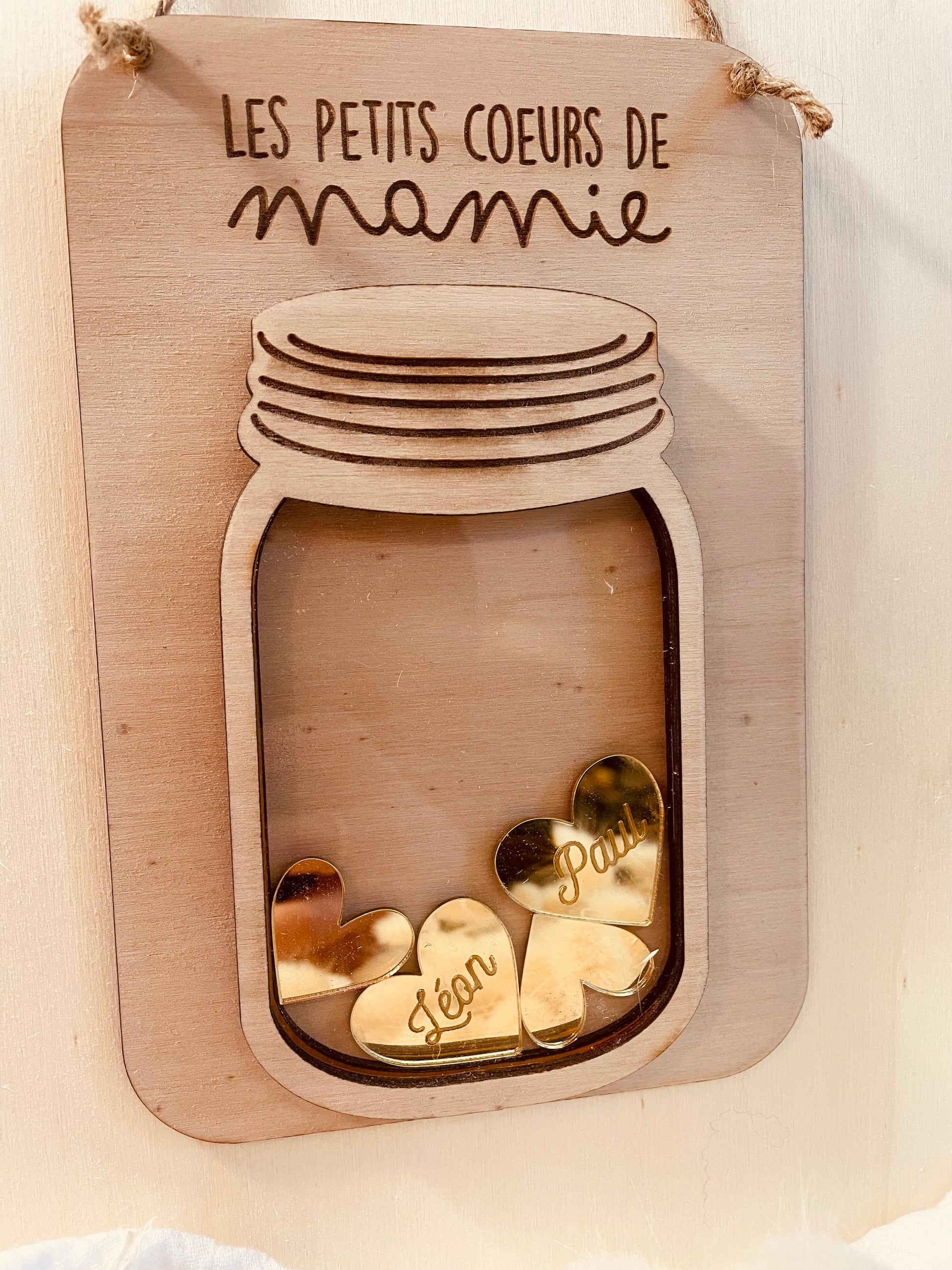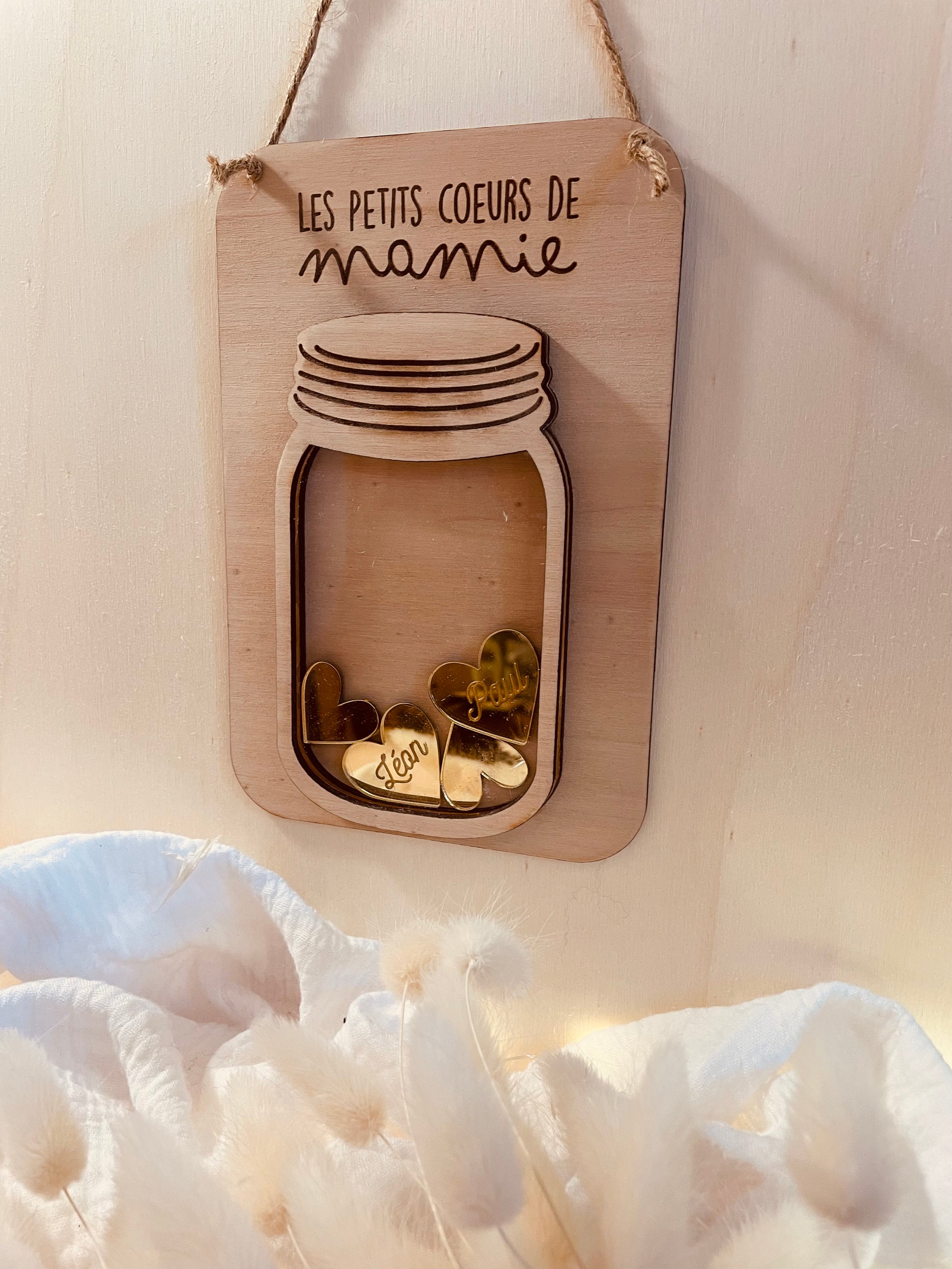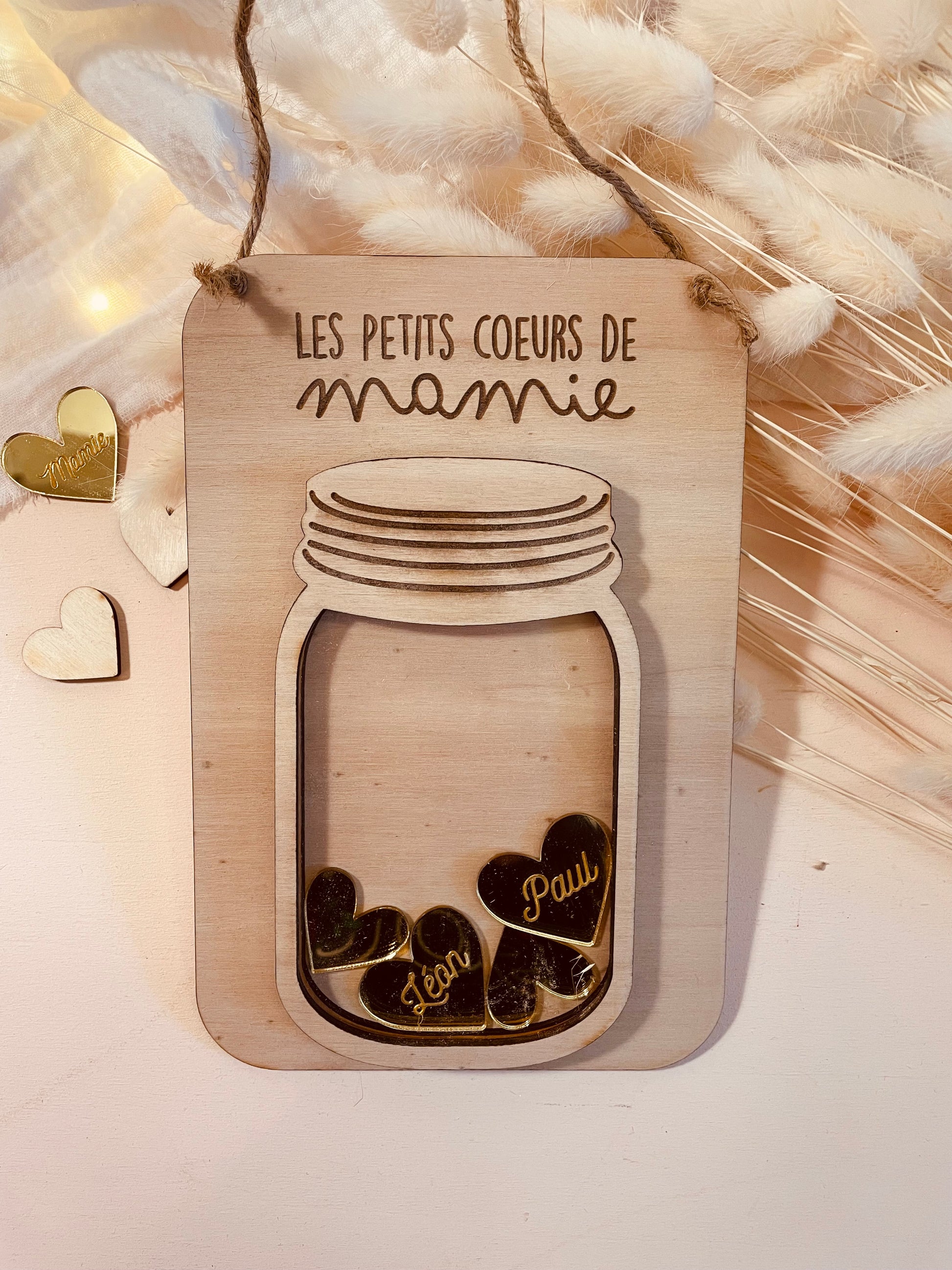 Vous pourrez offrir cette jolie décoration à votre mamie. Nous y glisserons les petits cœurs correspondant aux enfants et/ou petits enfants. Coup de cœur assuré !