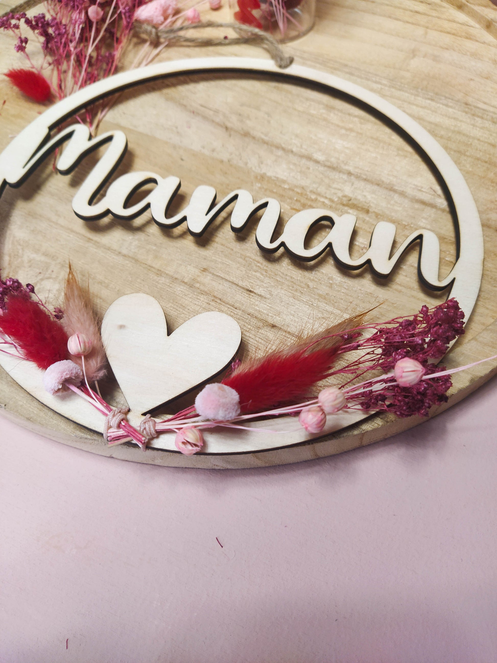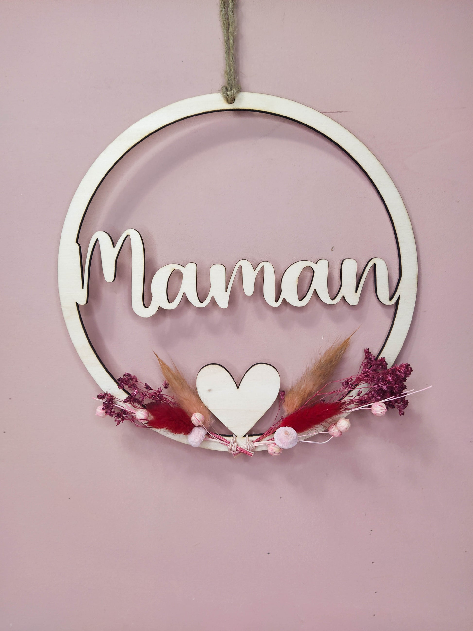 Craquez pour cette jolie couronne en bois découpé qui mettra à l'honneur votre douce maman qui donnera une touche unique à votre décoration avec ces jolis fleurs séchés.