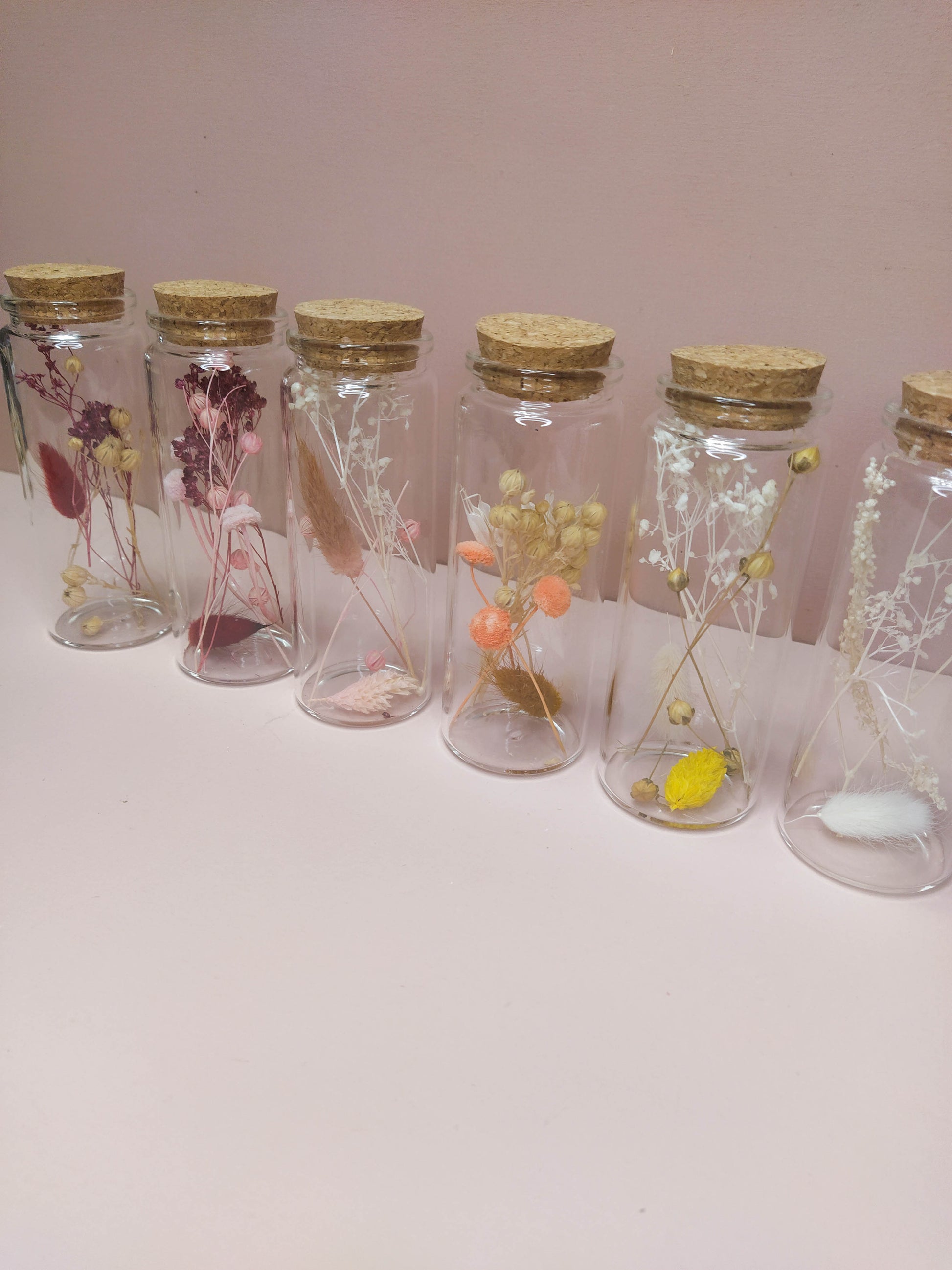 - Matière : Fiole en verre, fleurs séchées et mot en bois - contreplaqué de peuplier 3 mm