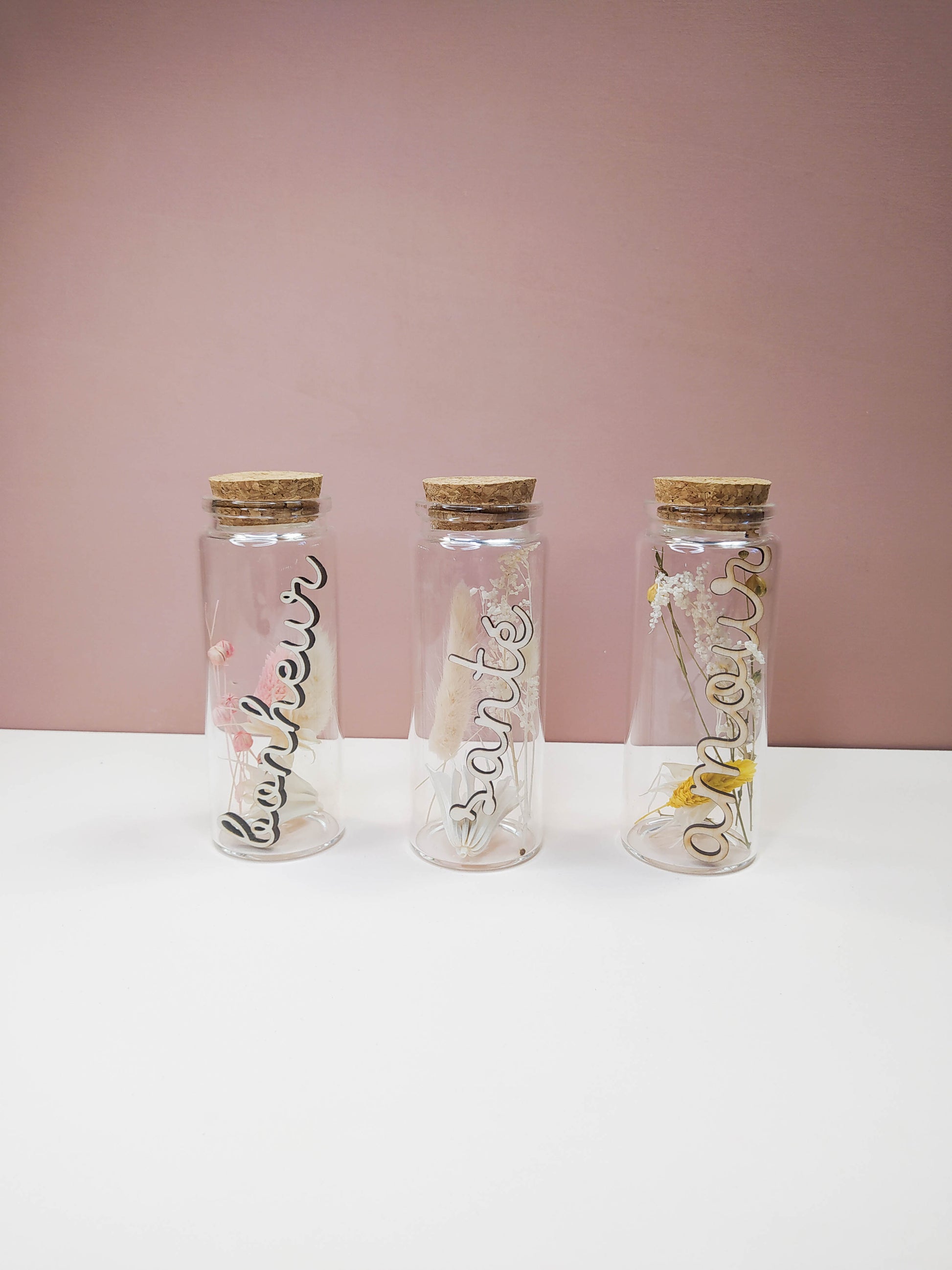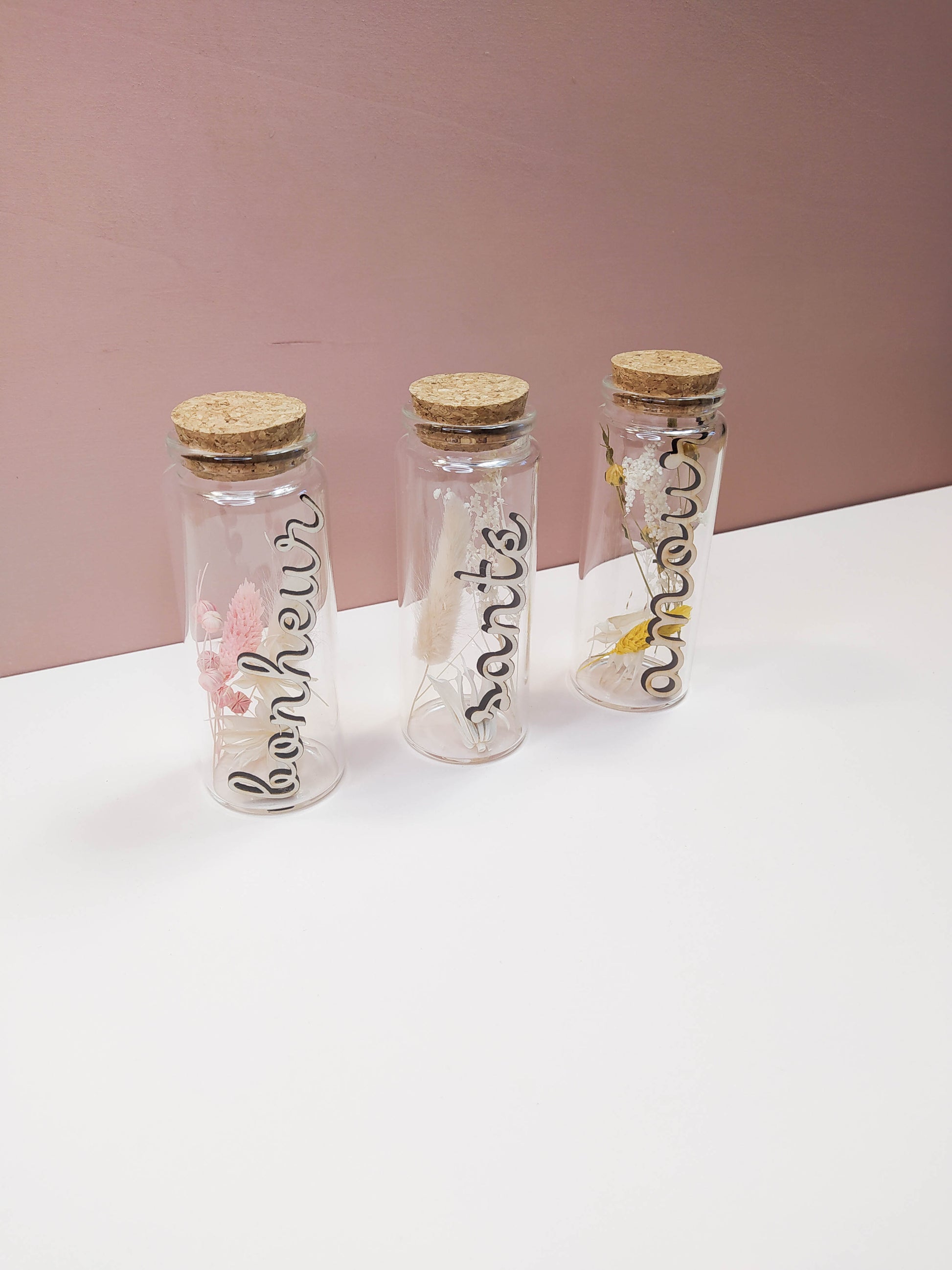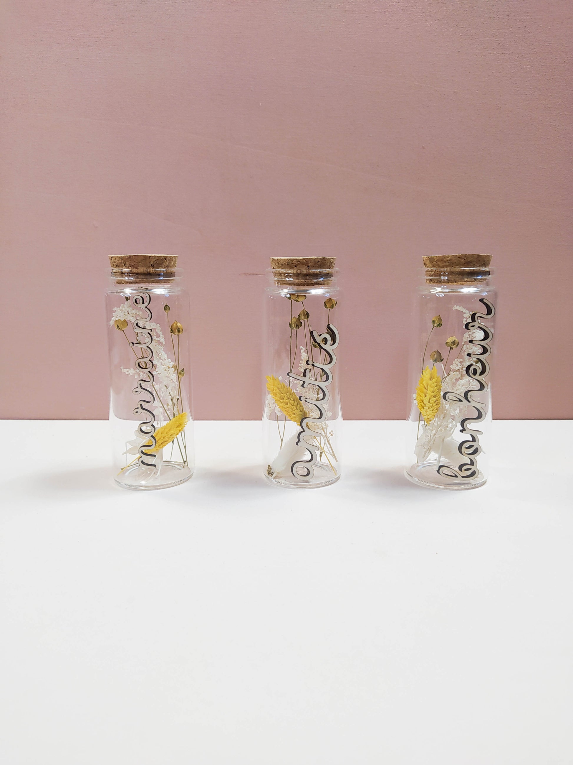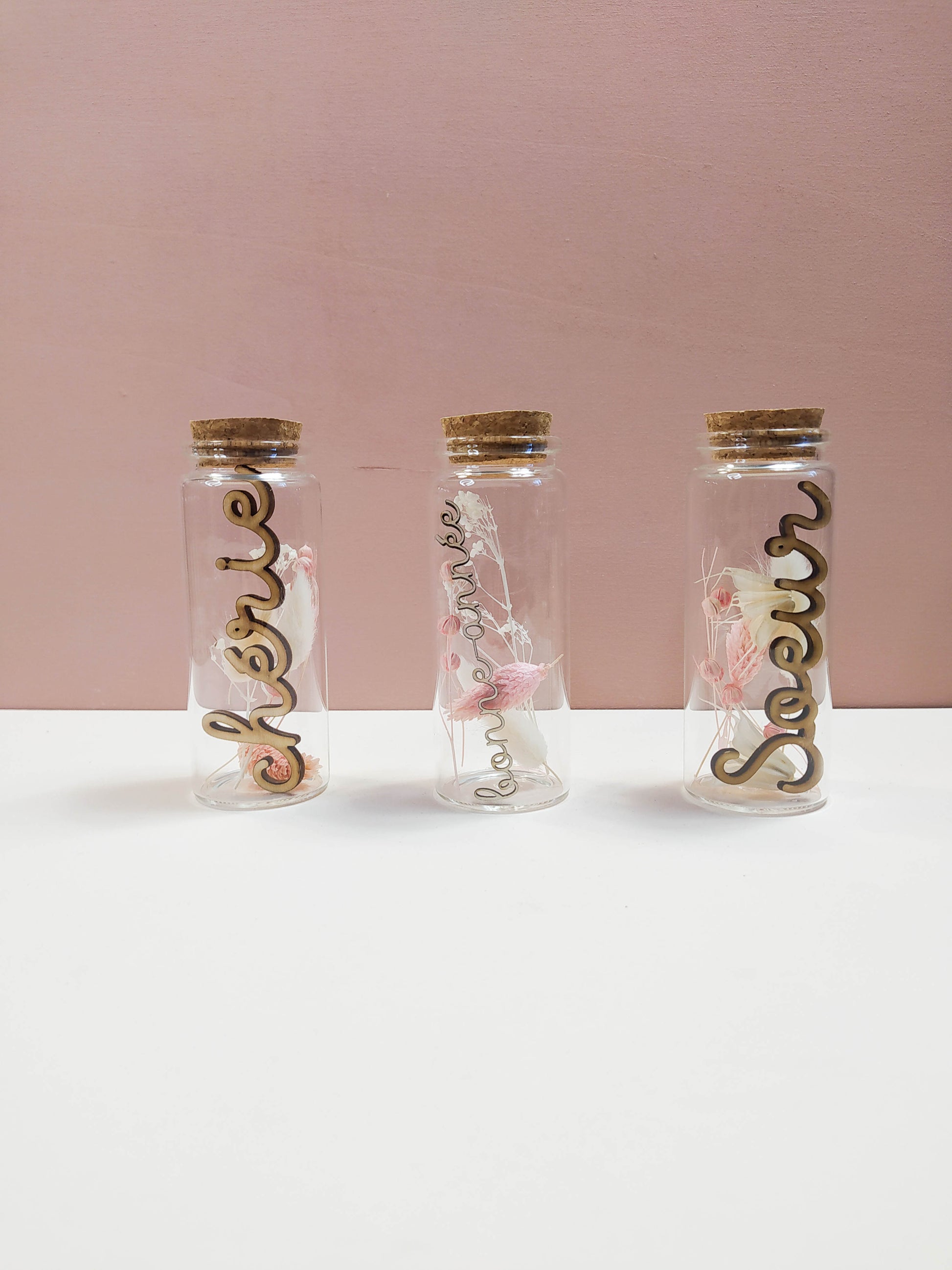 FIOLE FLEURS SÉCHÉES À MESSAGE mot en bois - PERSONNALISABLE
