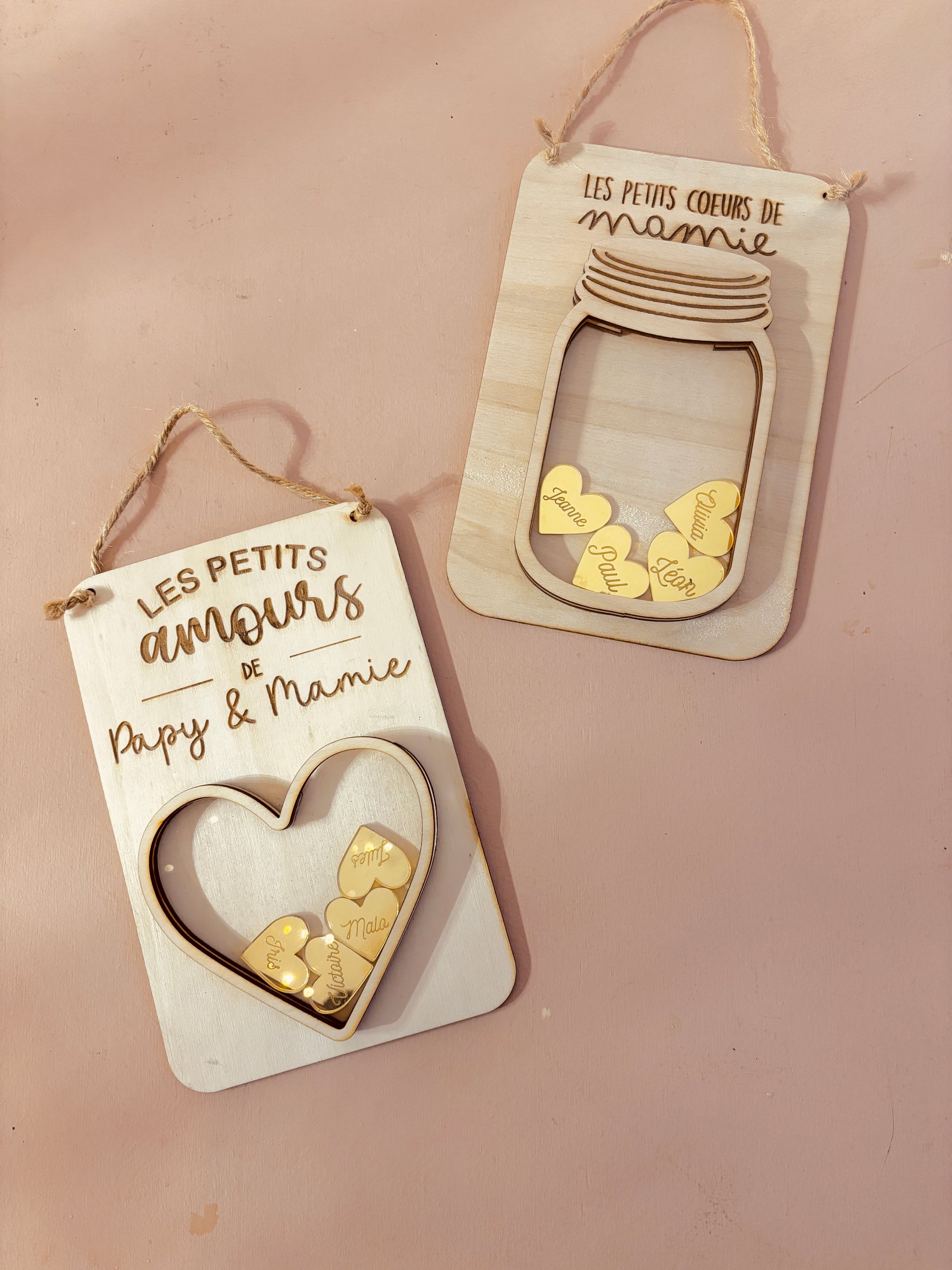 Vous pourrez offrir cette jolie décoration à votre papy/ mamie ou autres . Nous y glisserons les petits cœurs correspondant aux enfants et/ou petits enfants. Coup de cœur assuré !
