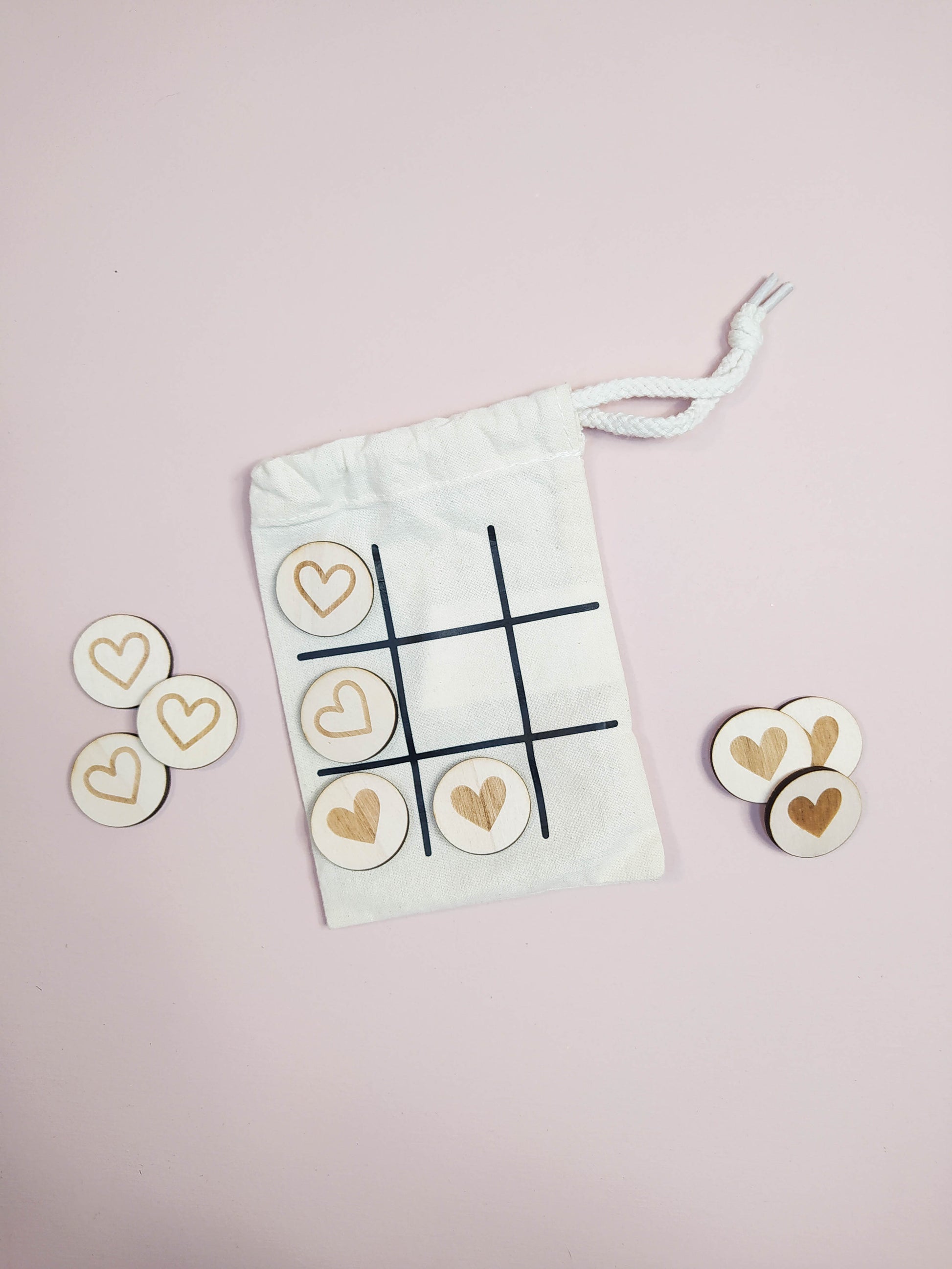 Le fameux jeu du morpion en version voyage composé de petits pions et de son pochon.
