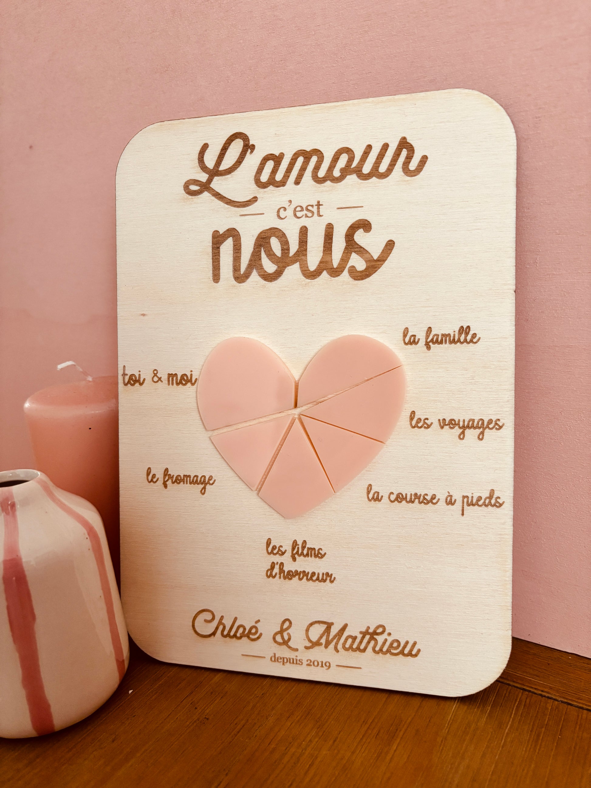 Vous pourrez offrir ou vous offrir cette pancarte . Vous y glisserez les petites mots qui la/le caractérise votre histoire d'amour. Coup de cœur assuré !