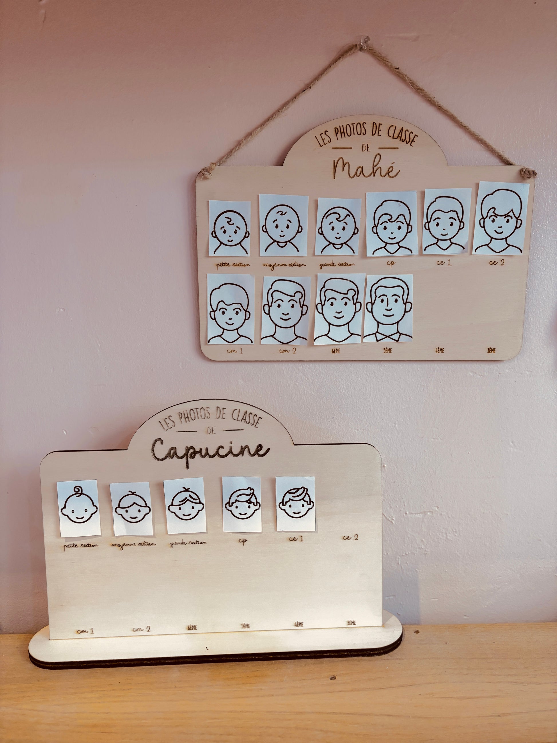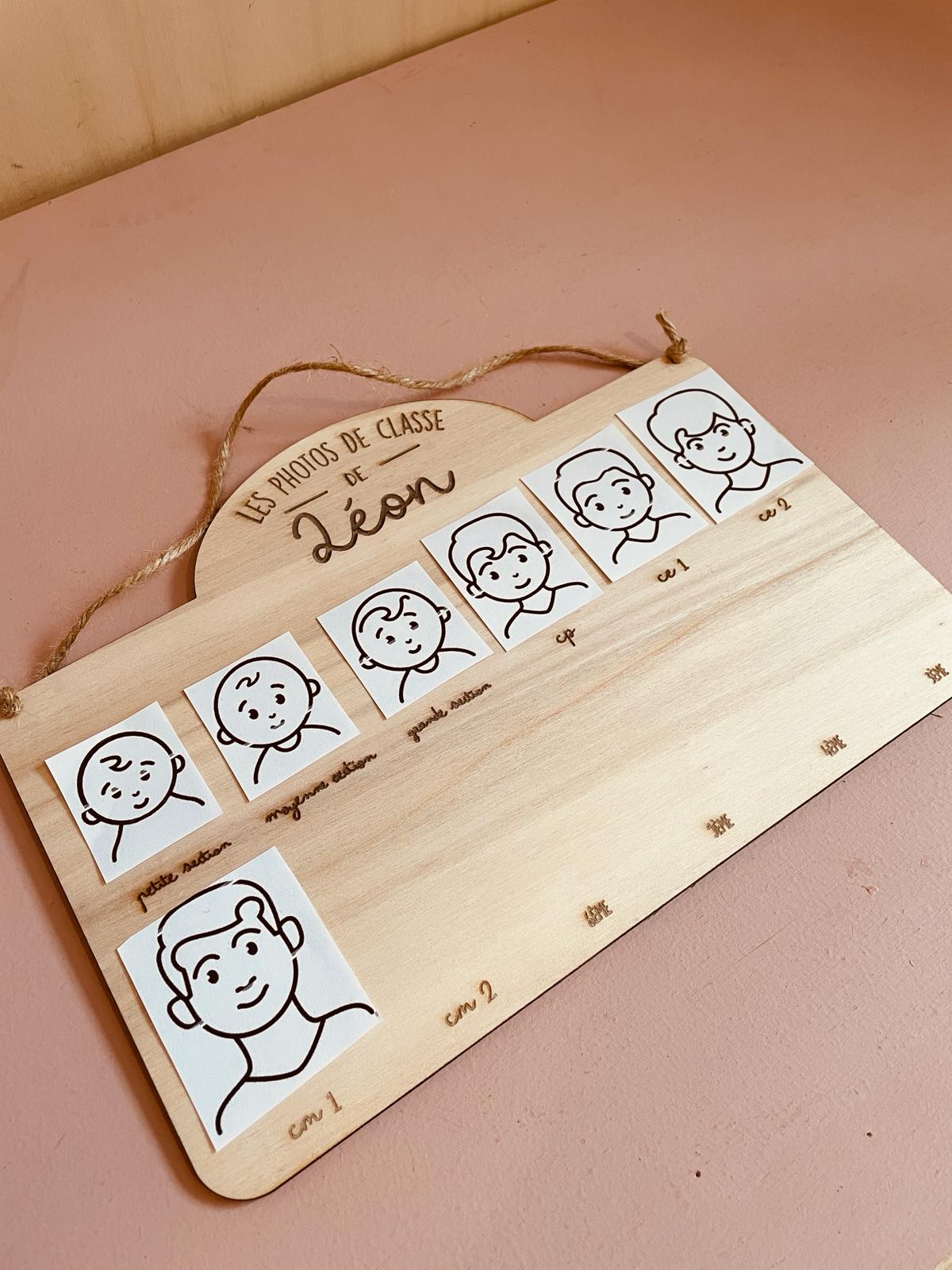 Craquez pour ce joli support pour photos de classe en bois personnalisé avec le prénom de l'enfant. Il sera votre allié pour collecter les photos de classe de votre enfant et voir son évolution d'année en année.