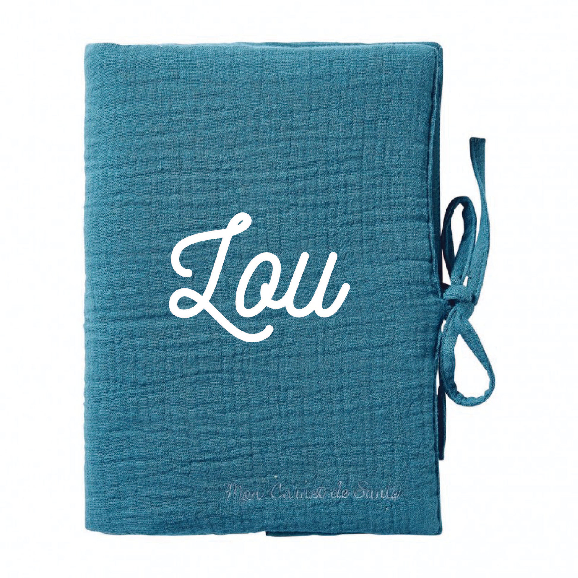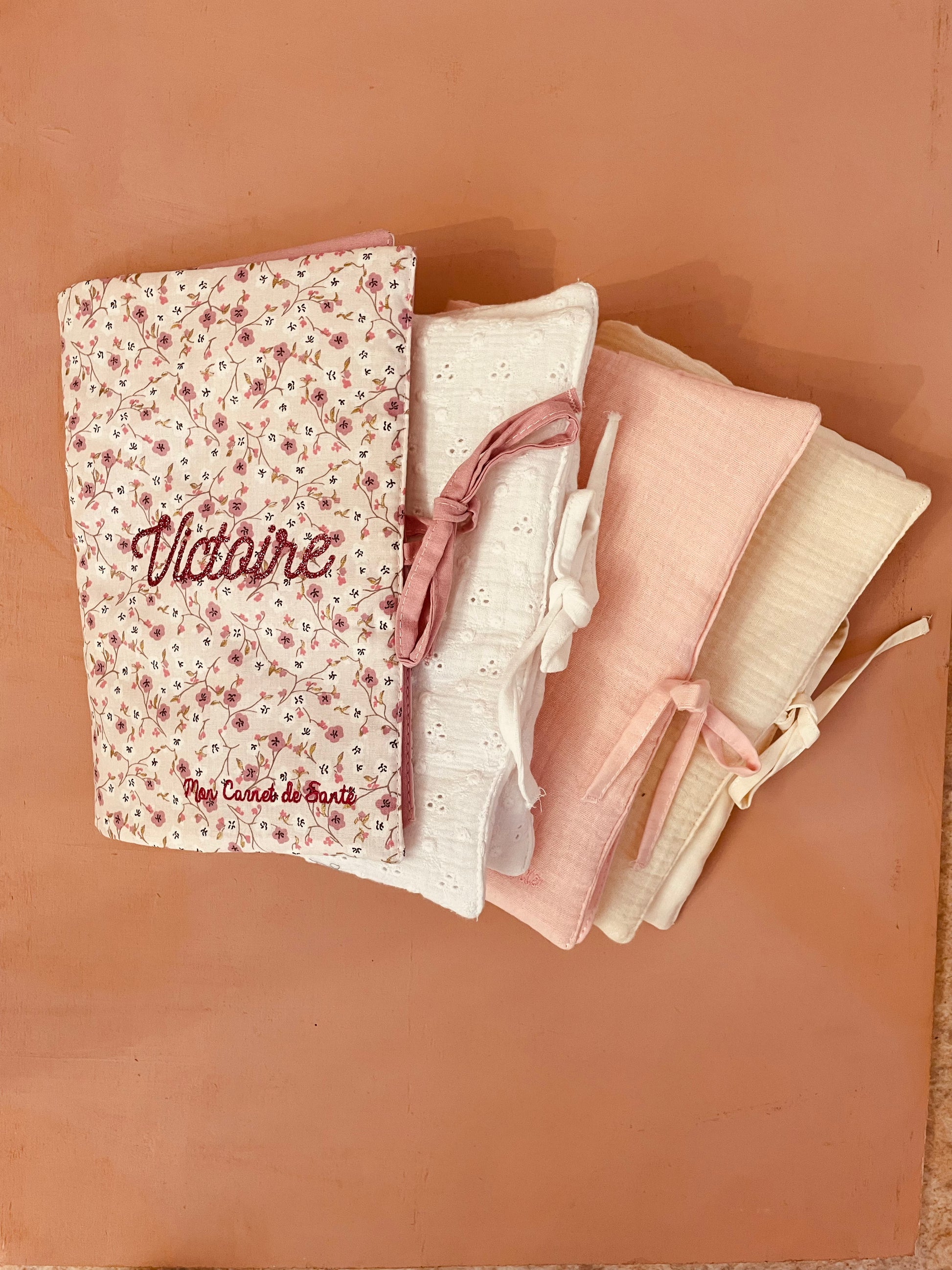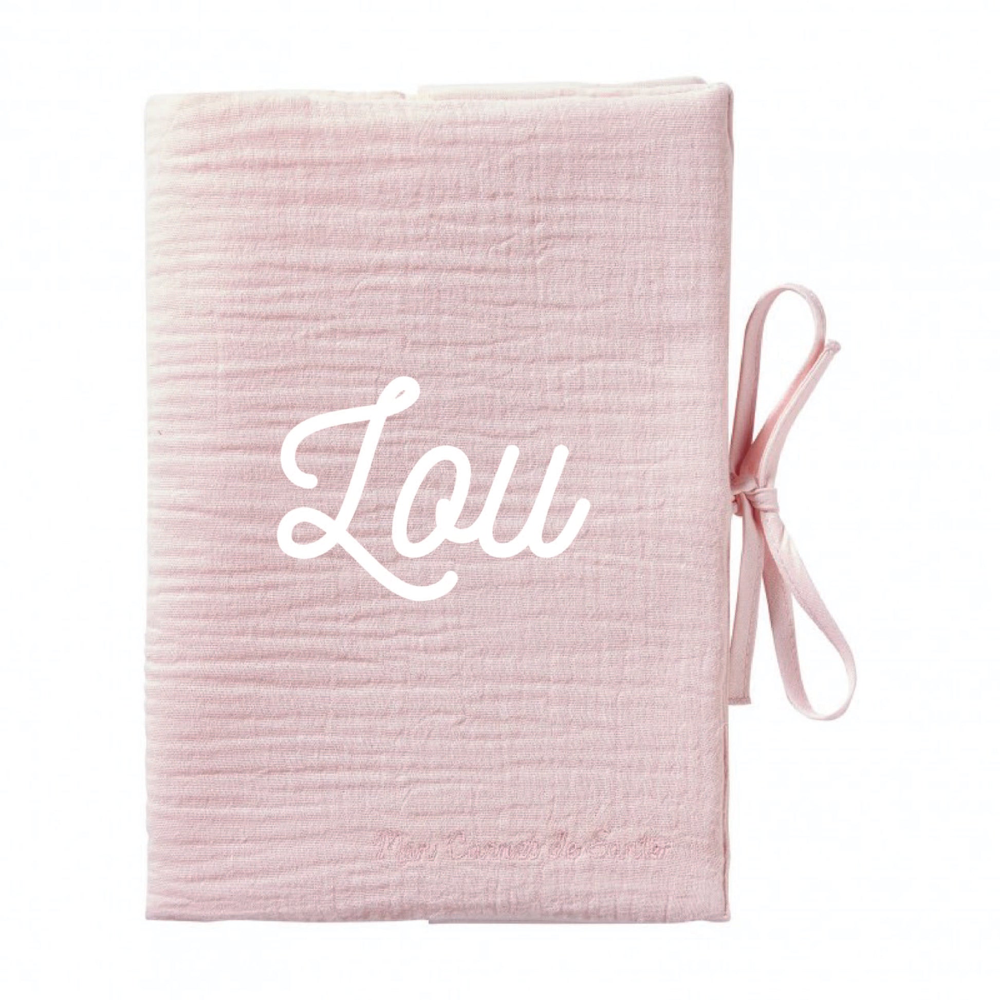 Un protège carnet de santé joli et pratique en double gaze pur coton, légèrement rembourré et personnalisé au prénom l'enfant.