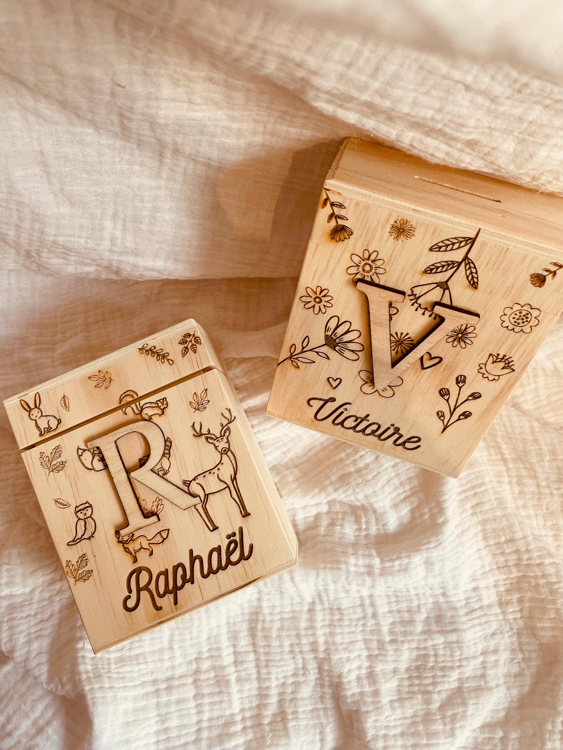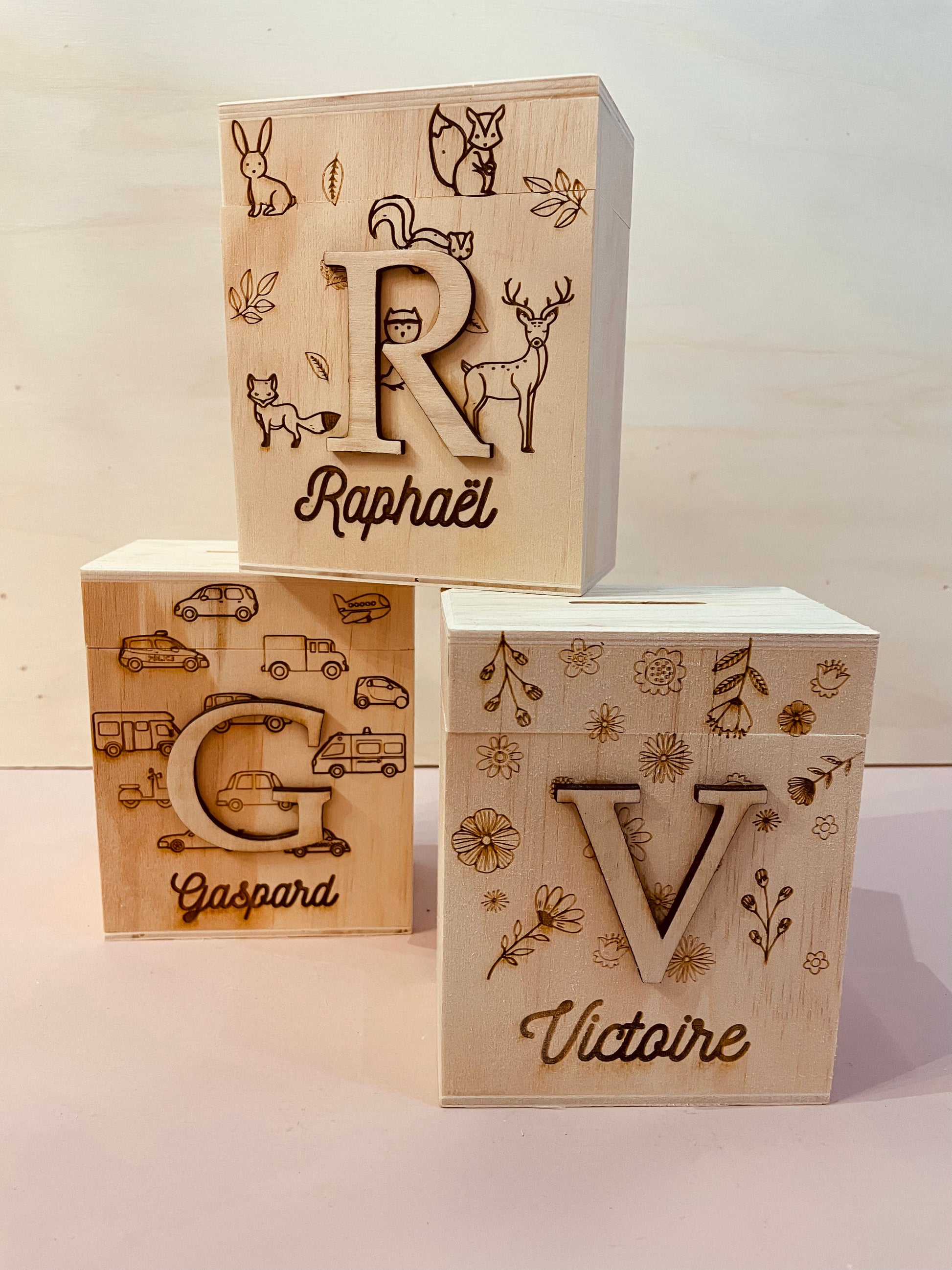 Tirelire en bois à personnaliser au prénom de l'enfant. Vous pouvez également choisir le thème que vous souhaitez.