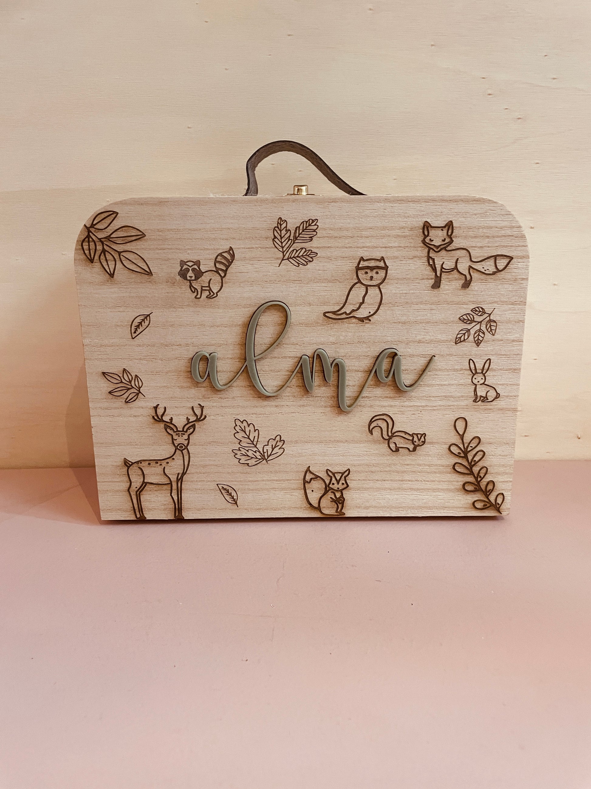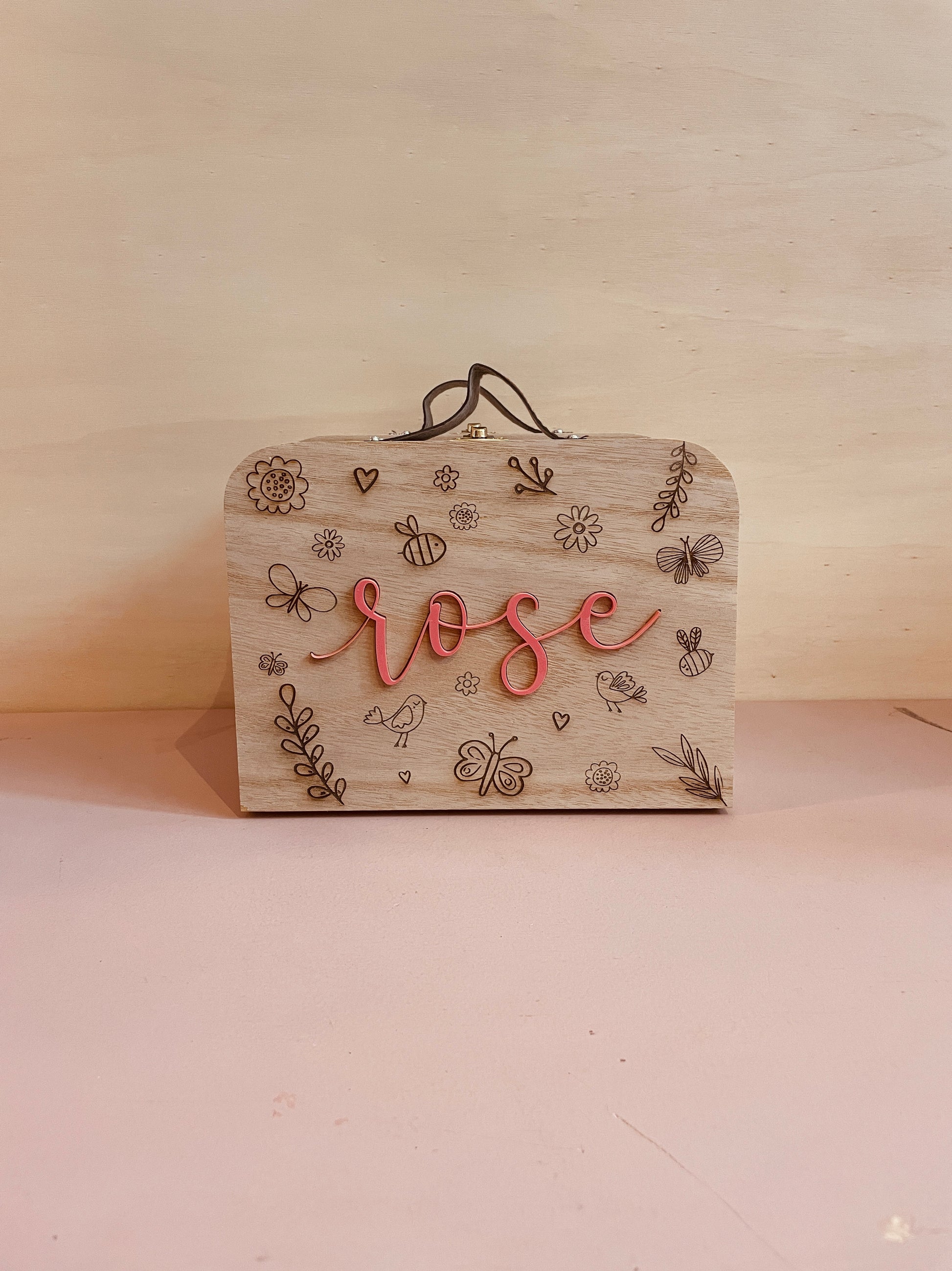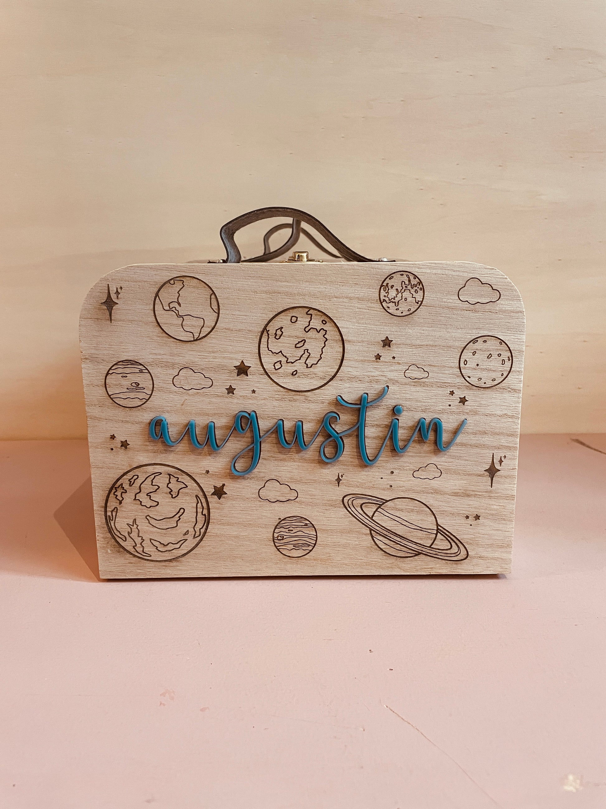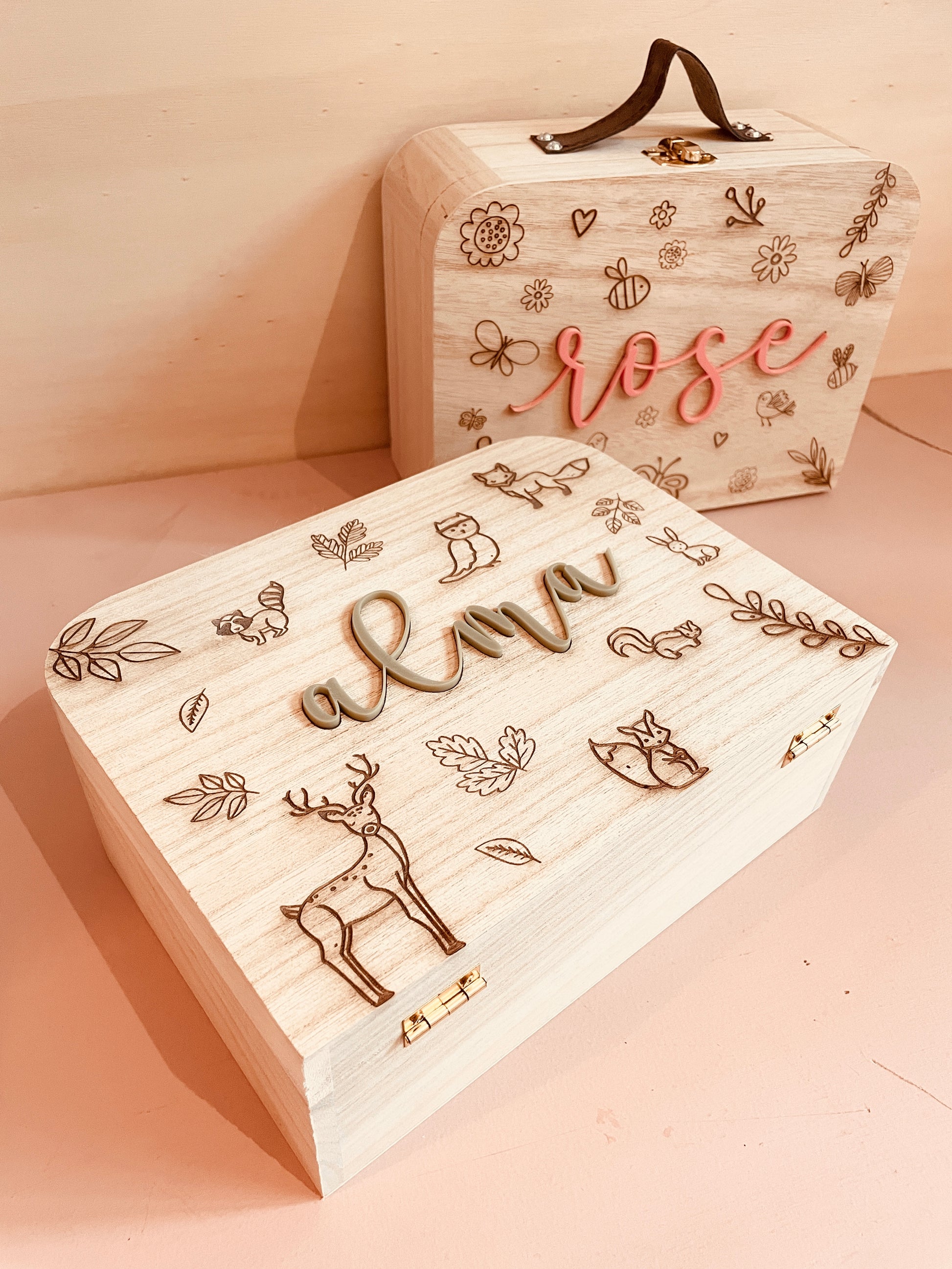La valise en bois personnalisée est idéale pour garder précieusement ses petits trésors et ses petits souvenirs. Pour ranger les petits souvenirs de bébé ou les affaires de la poupées, elle traversera les années.